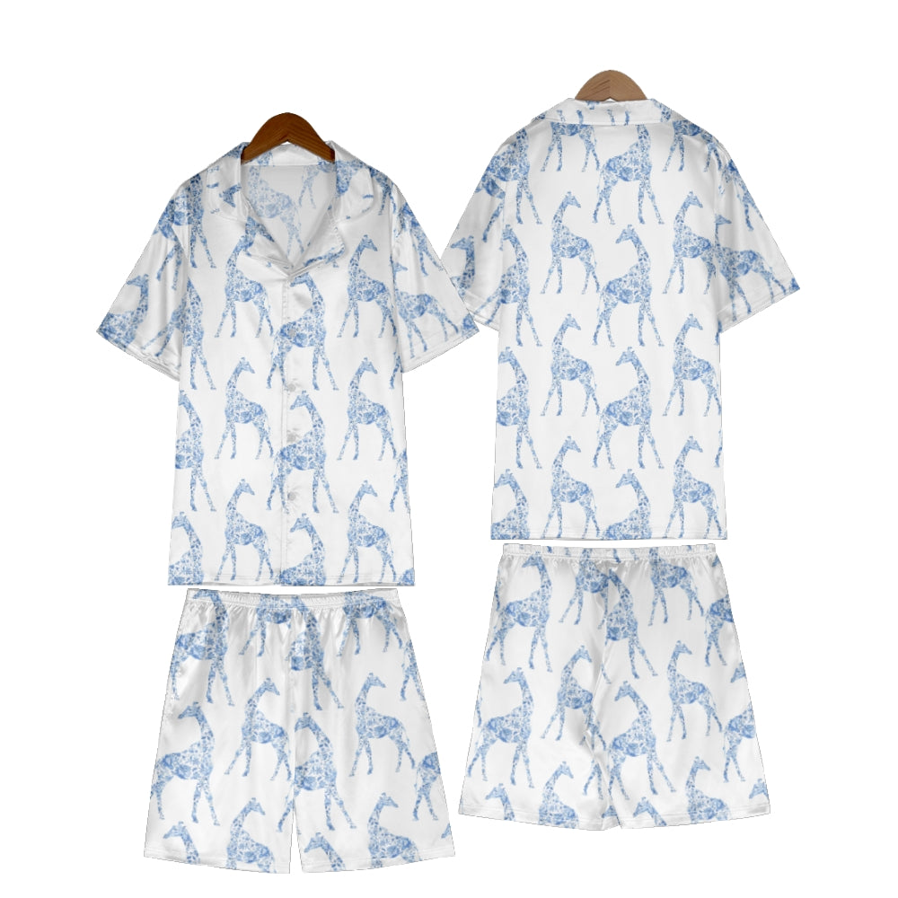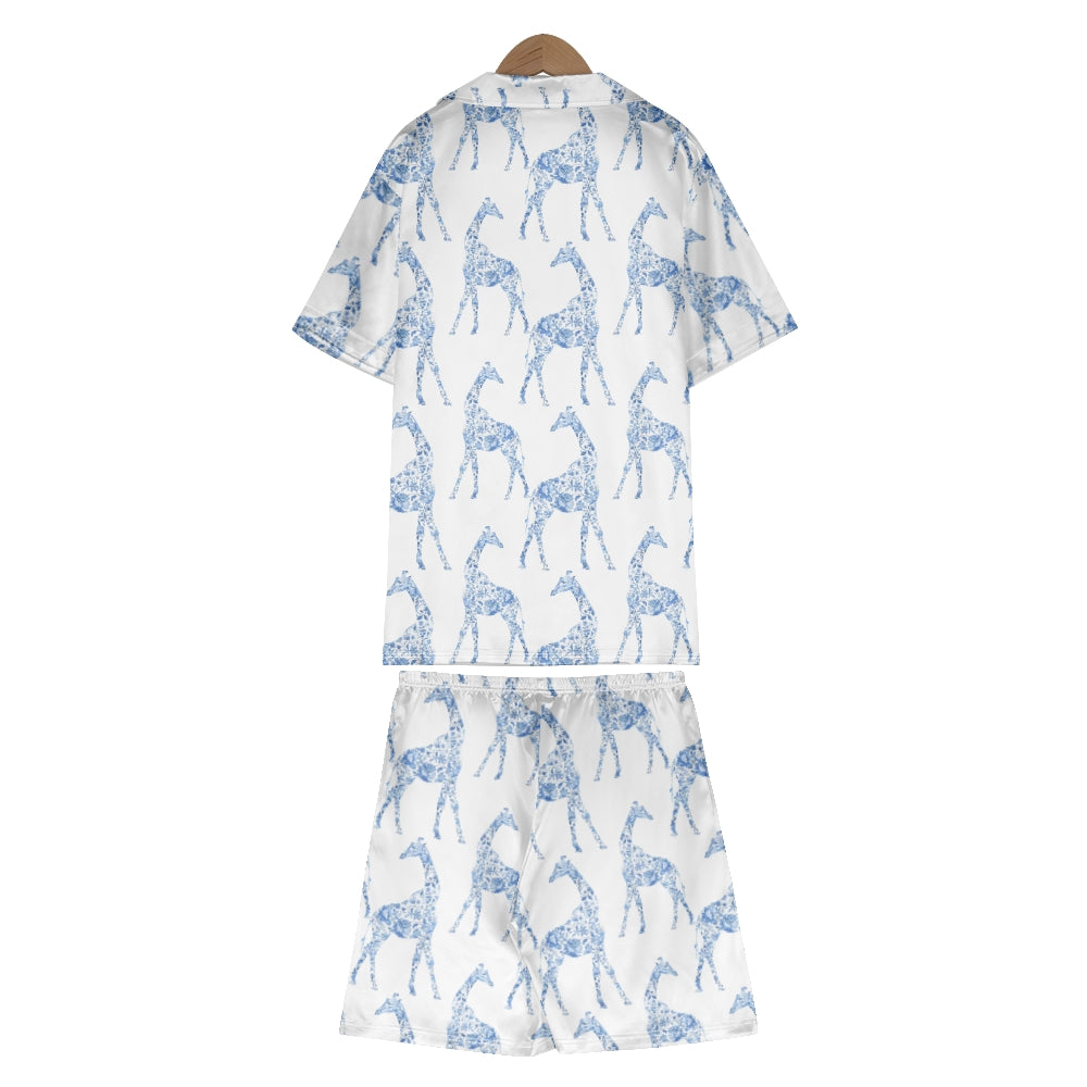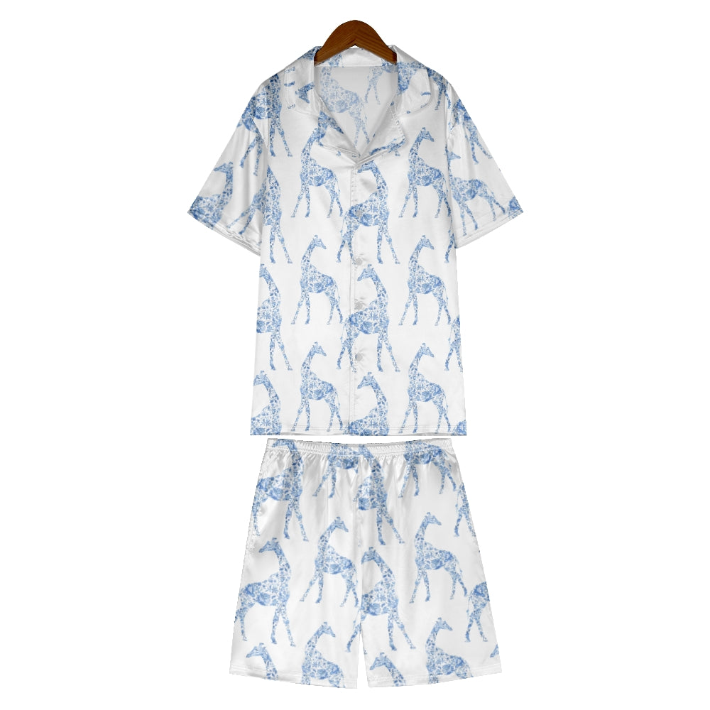 Blue Giraffe Toile De Jouy Satin Pajama Set For Women