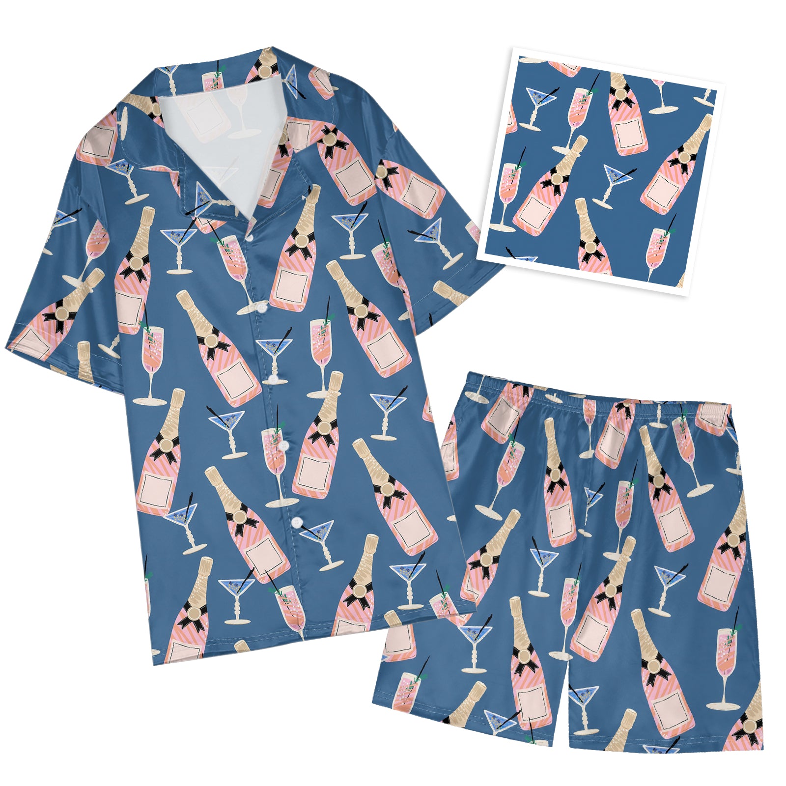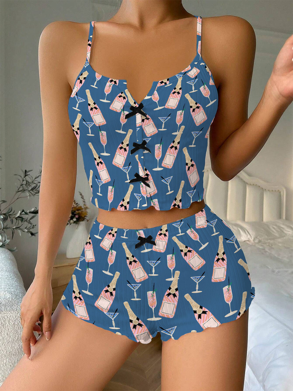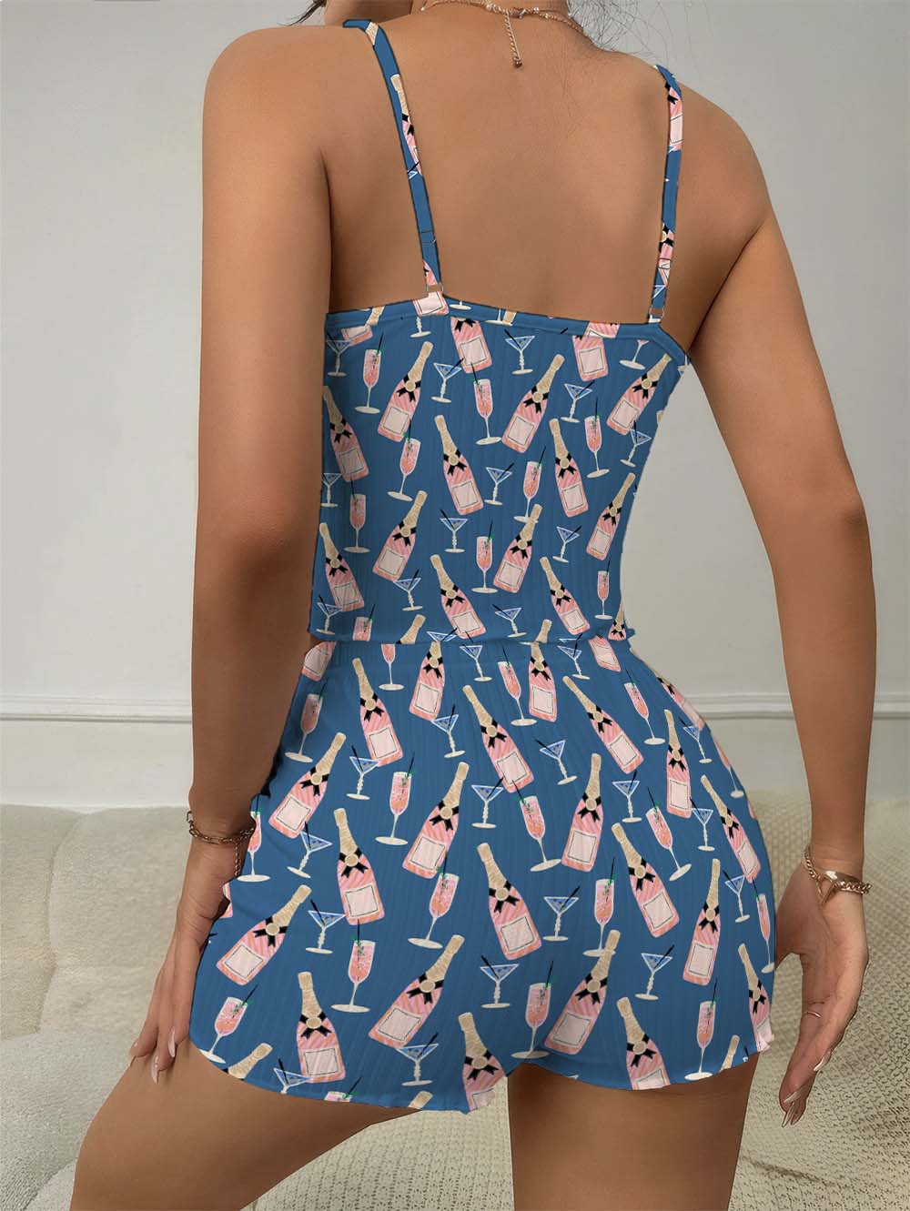 Wine Bottles and Champagne Bow Ribbed Knit Pajama Set For Women