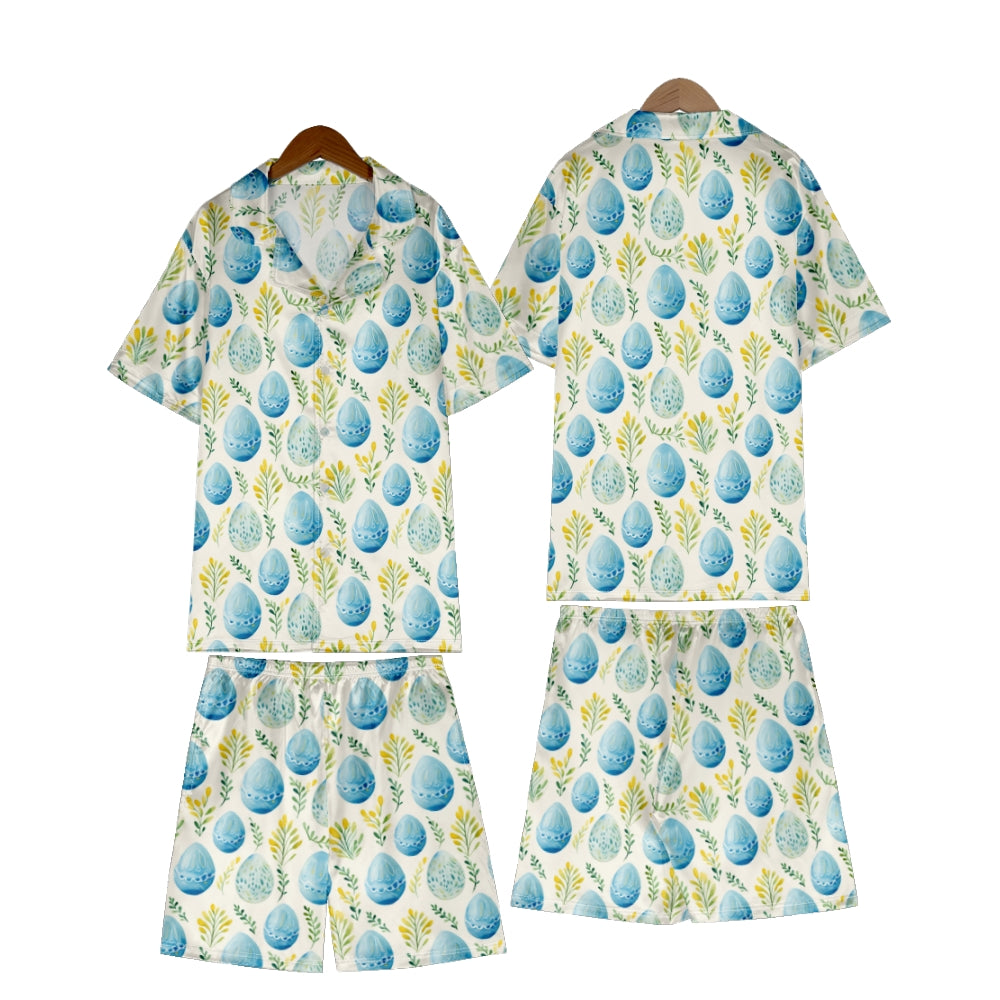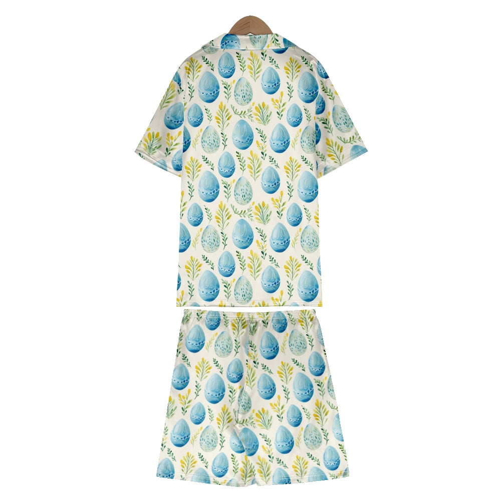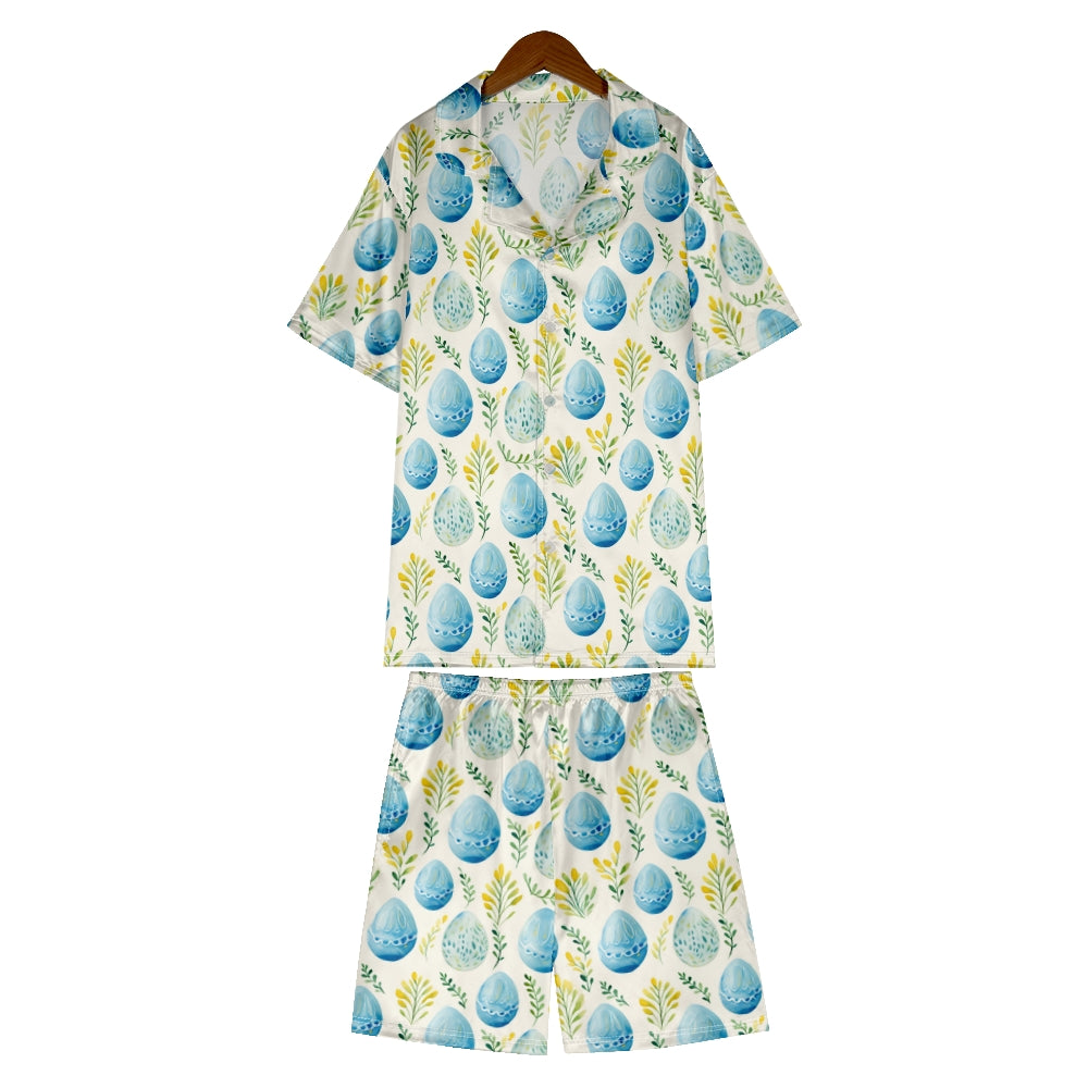 Blue Easter Eggs With Leaves Satin Pajama Set For Women