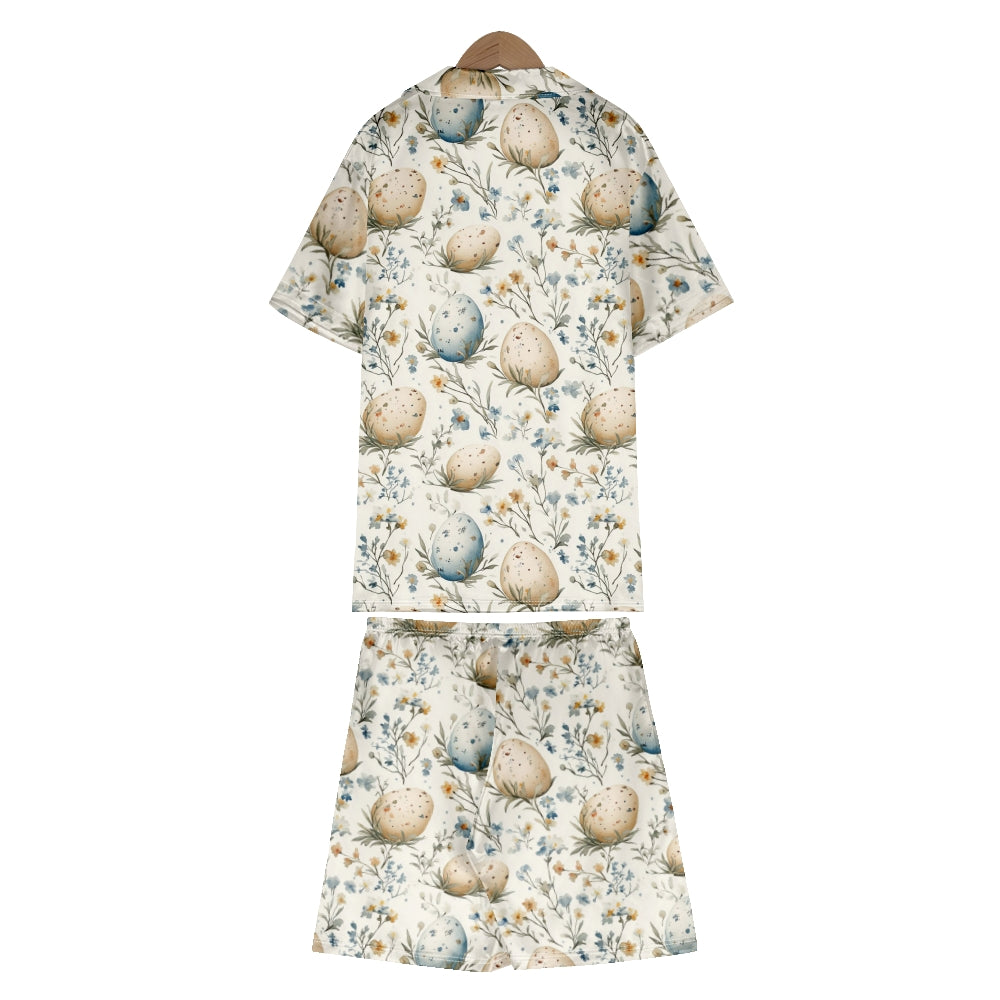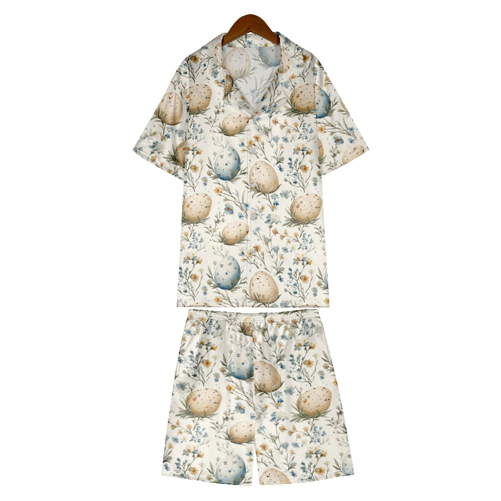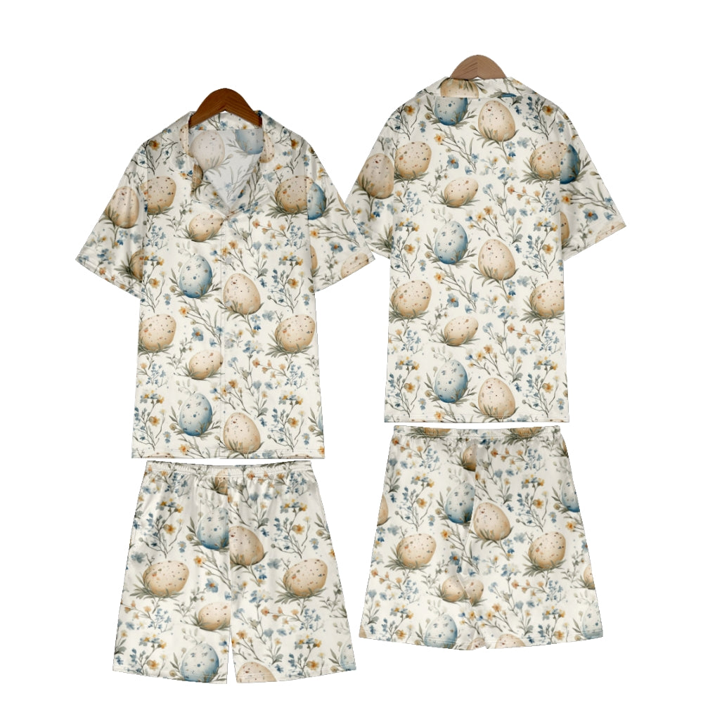 Blue Floral Easter Eggs Satin Pajama Set For Women