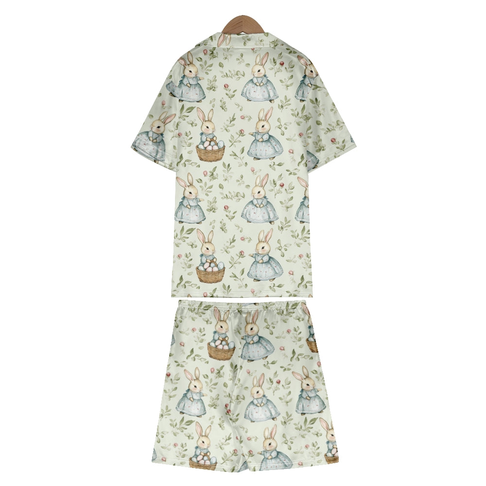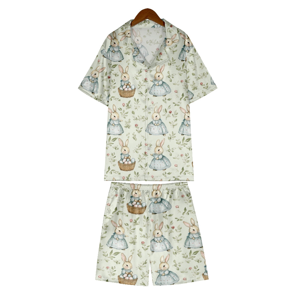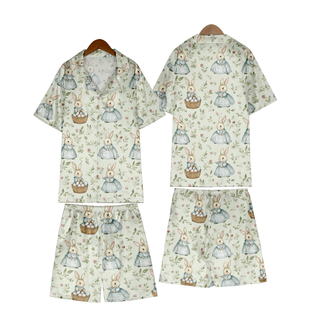Easter Green Floral Bunny Satin Pajama Set For Women