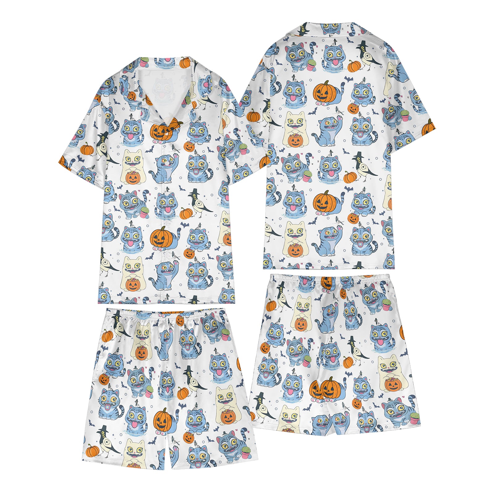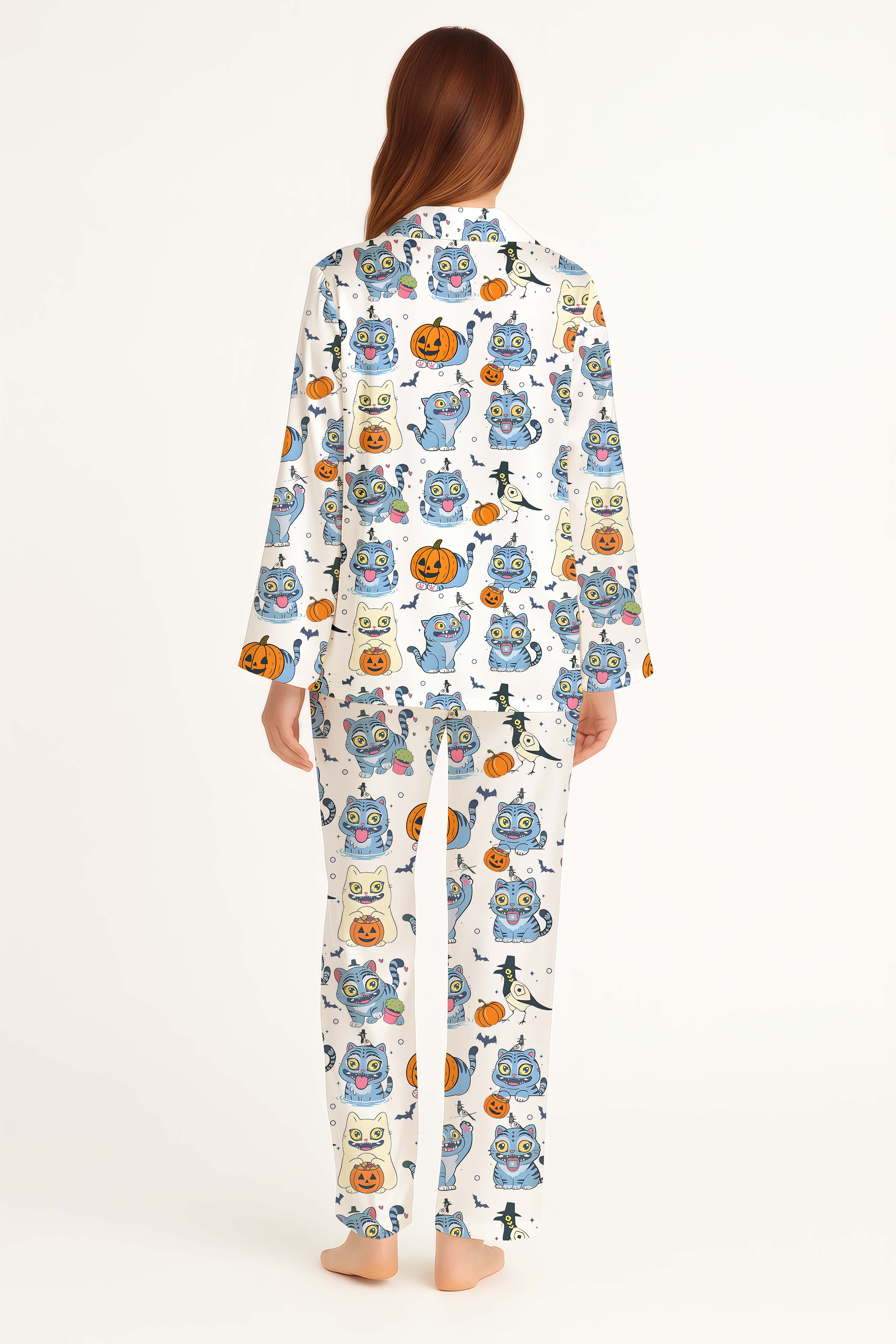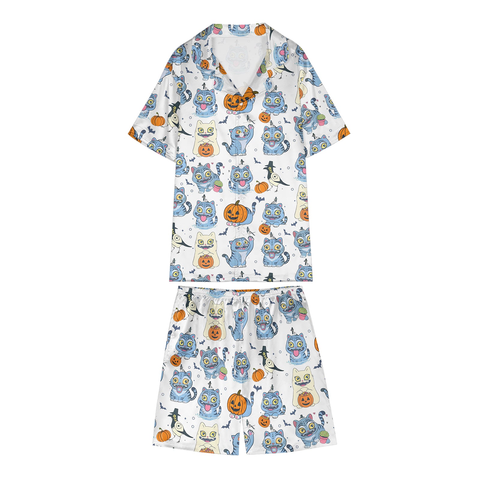 Cute Halloween Ghost Boo Cat Satin Pajama Set For Women
