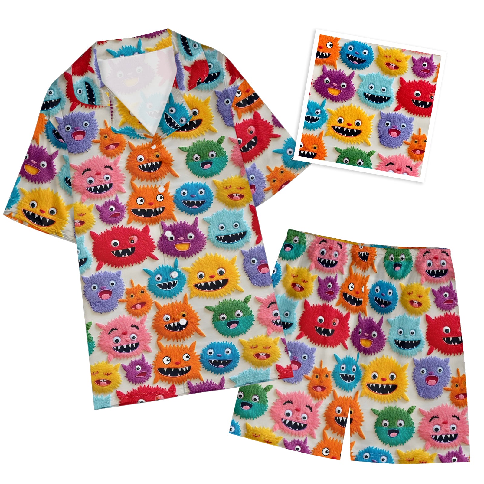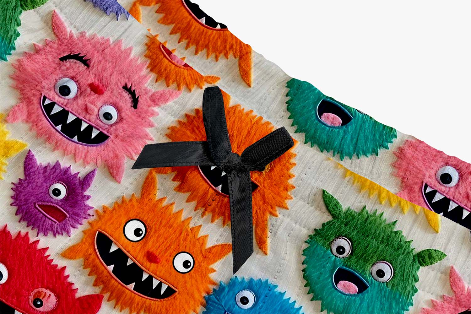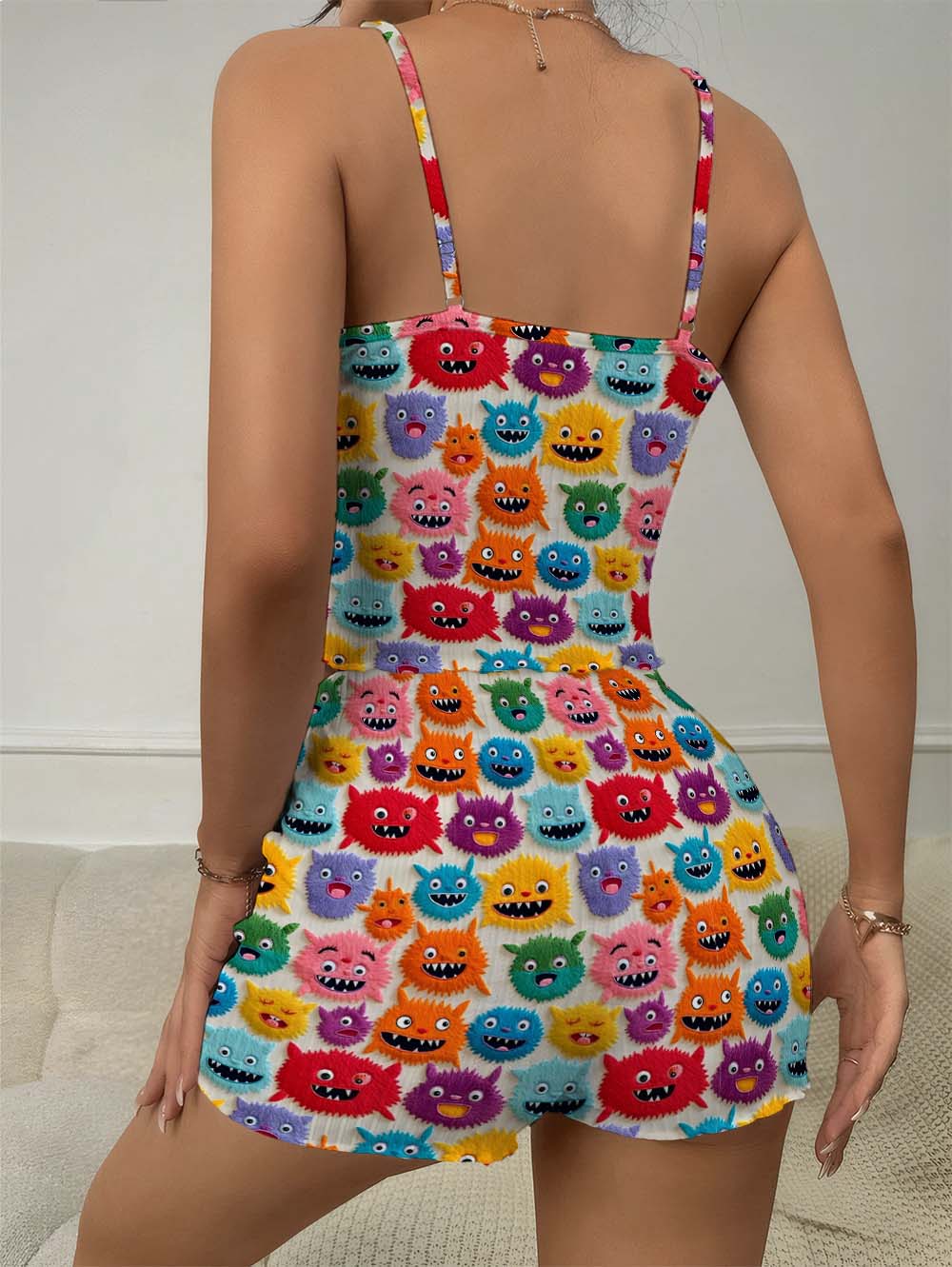 Halloween Cute Monsters 3D Embroidery Bow Ribbed Knit Pajama Set For Women