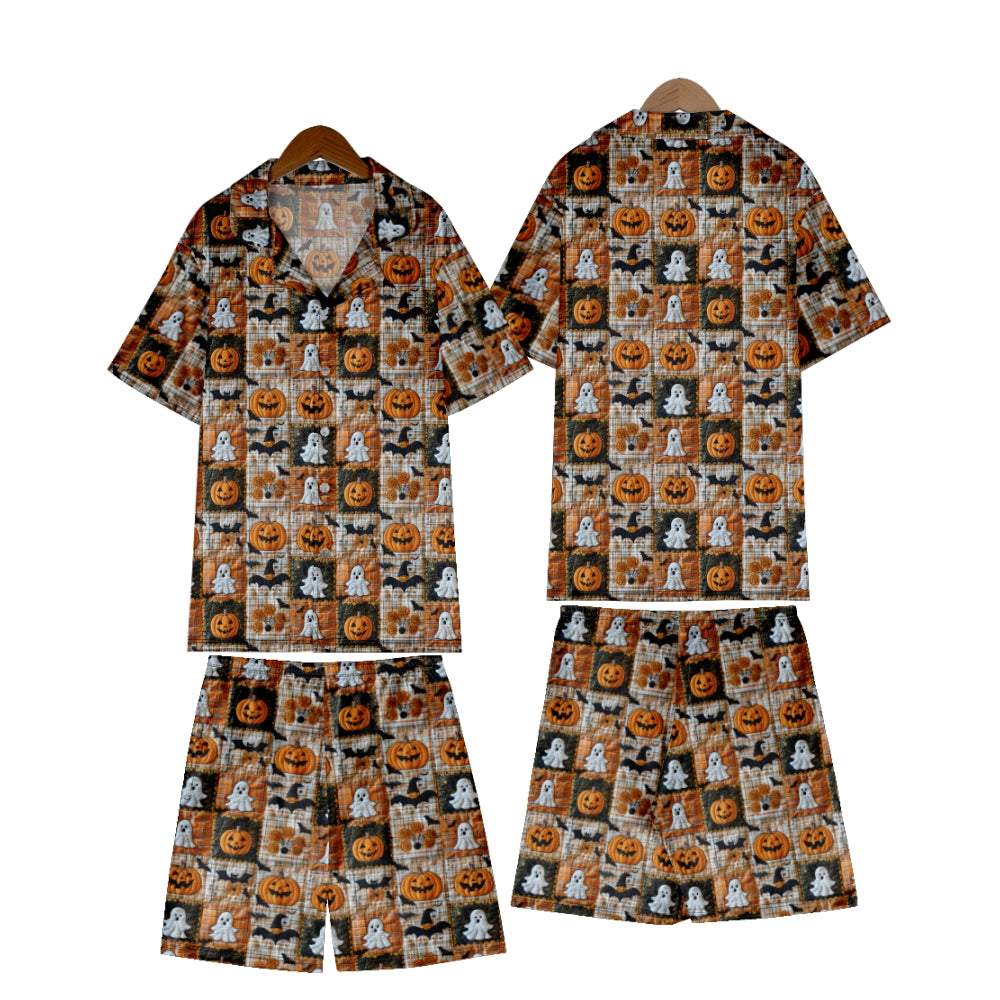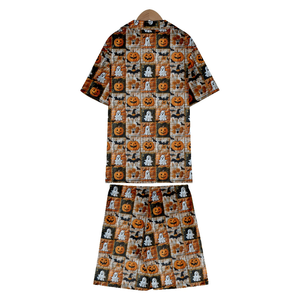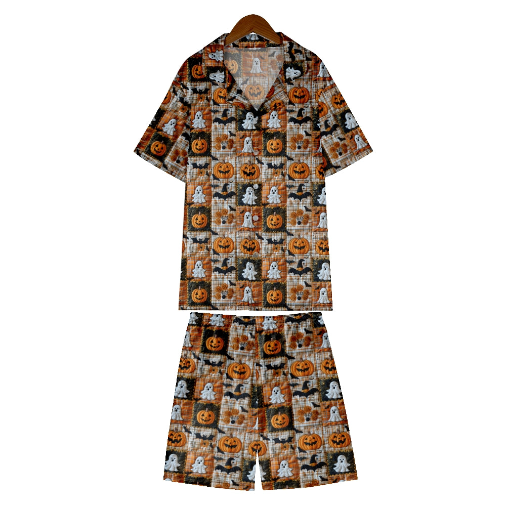 Halloween Patchwork Art 3D Embroidery Print Satin Pajama Set For Women