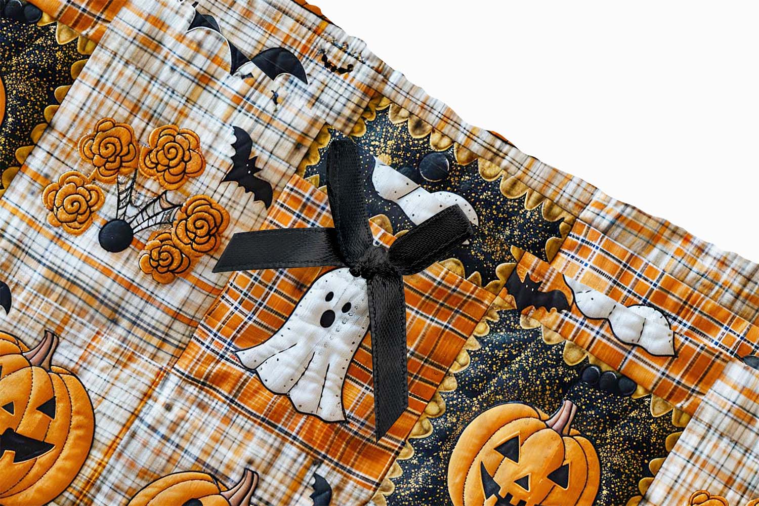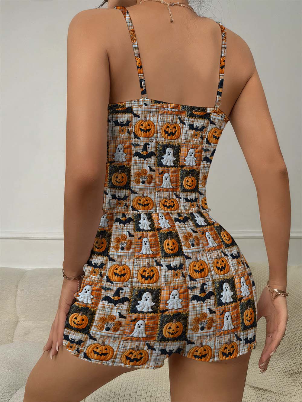 Halloween Patchwork Art Print Bow Ribbed Knit Pajama Set For Women