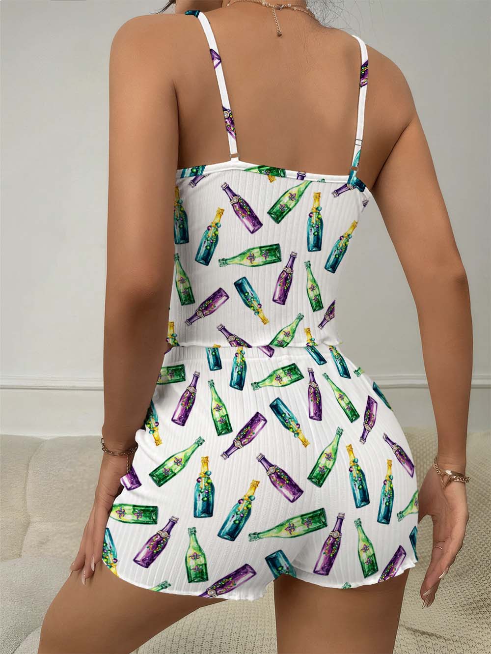 Mardi Gras Bottles Bow Ribbed Knit Pajama Set For Women
