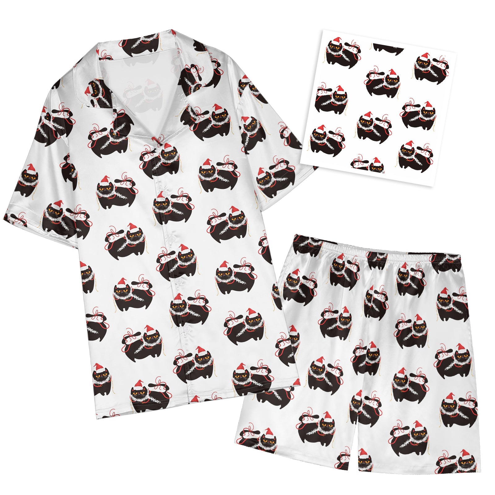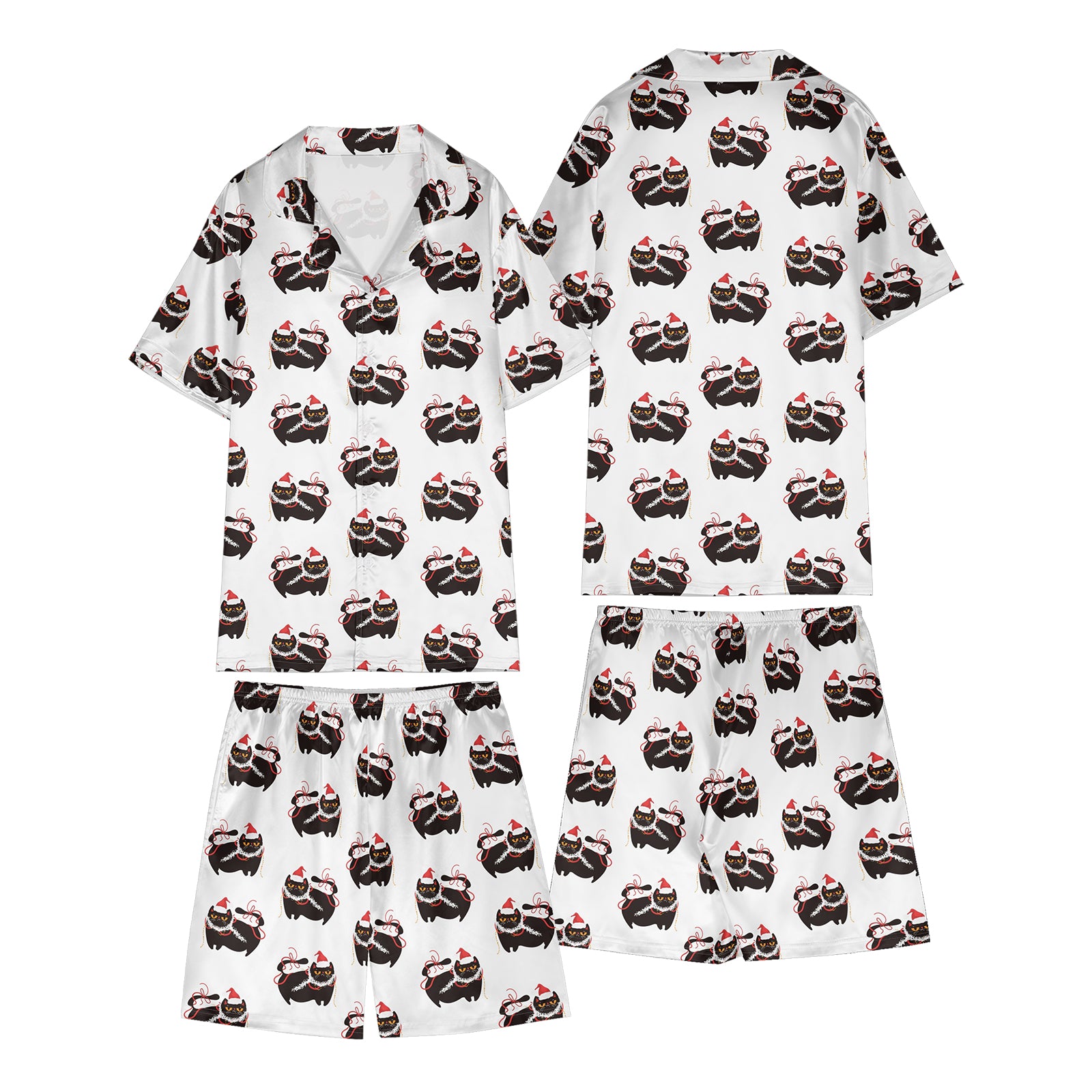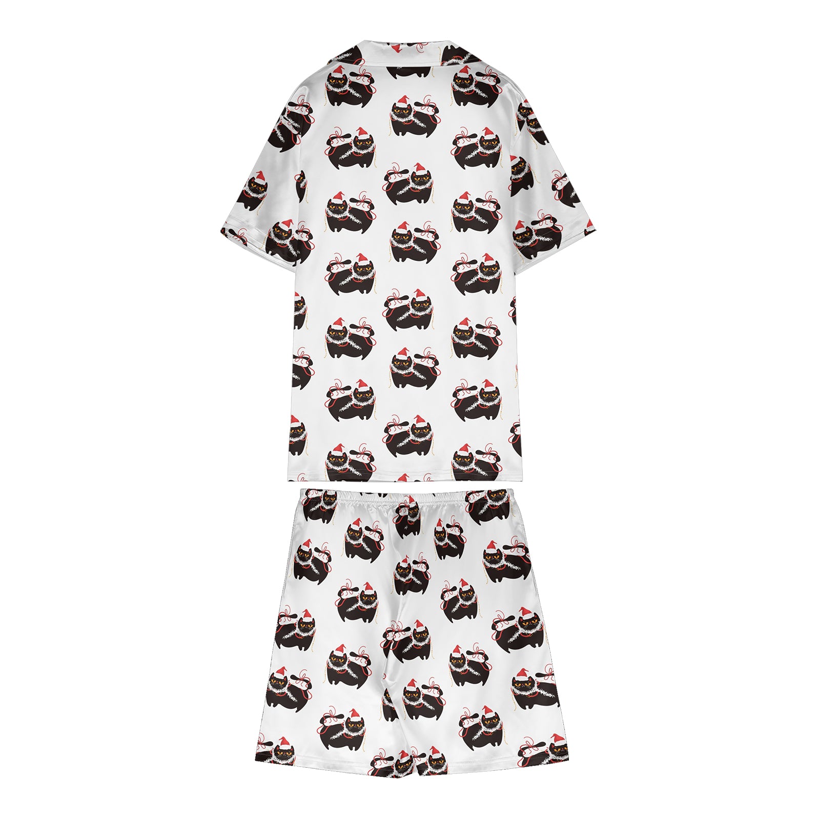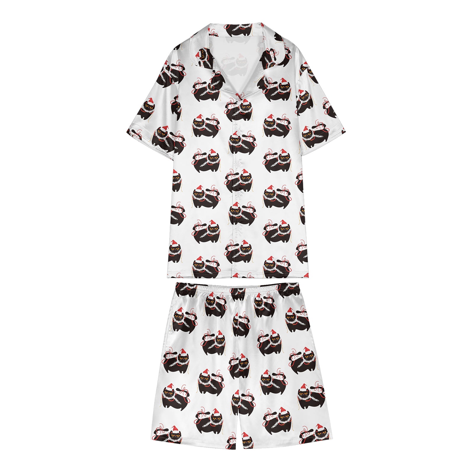 Black Cute Cat Christmas Satin Pajama Set For Women