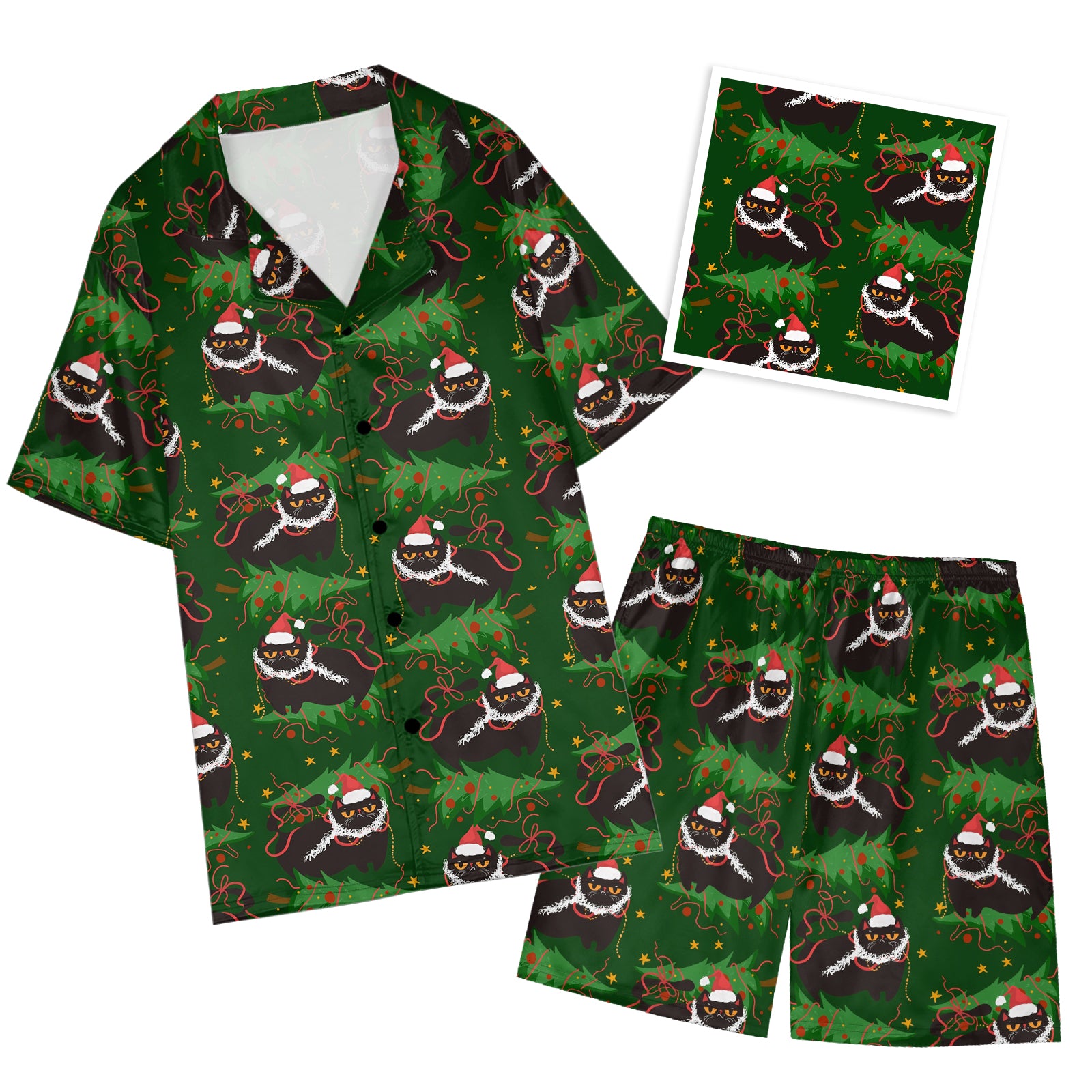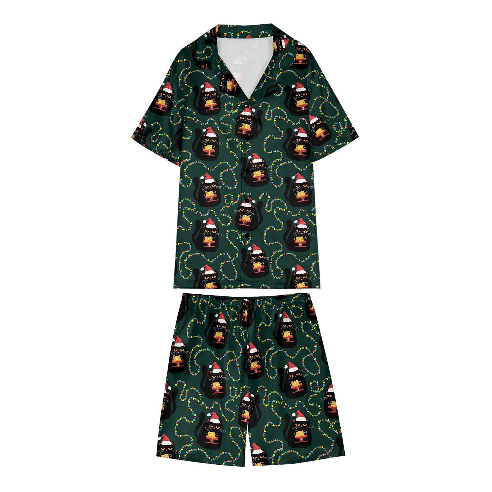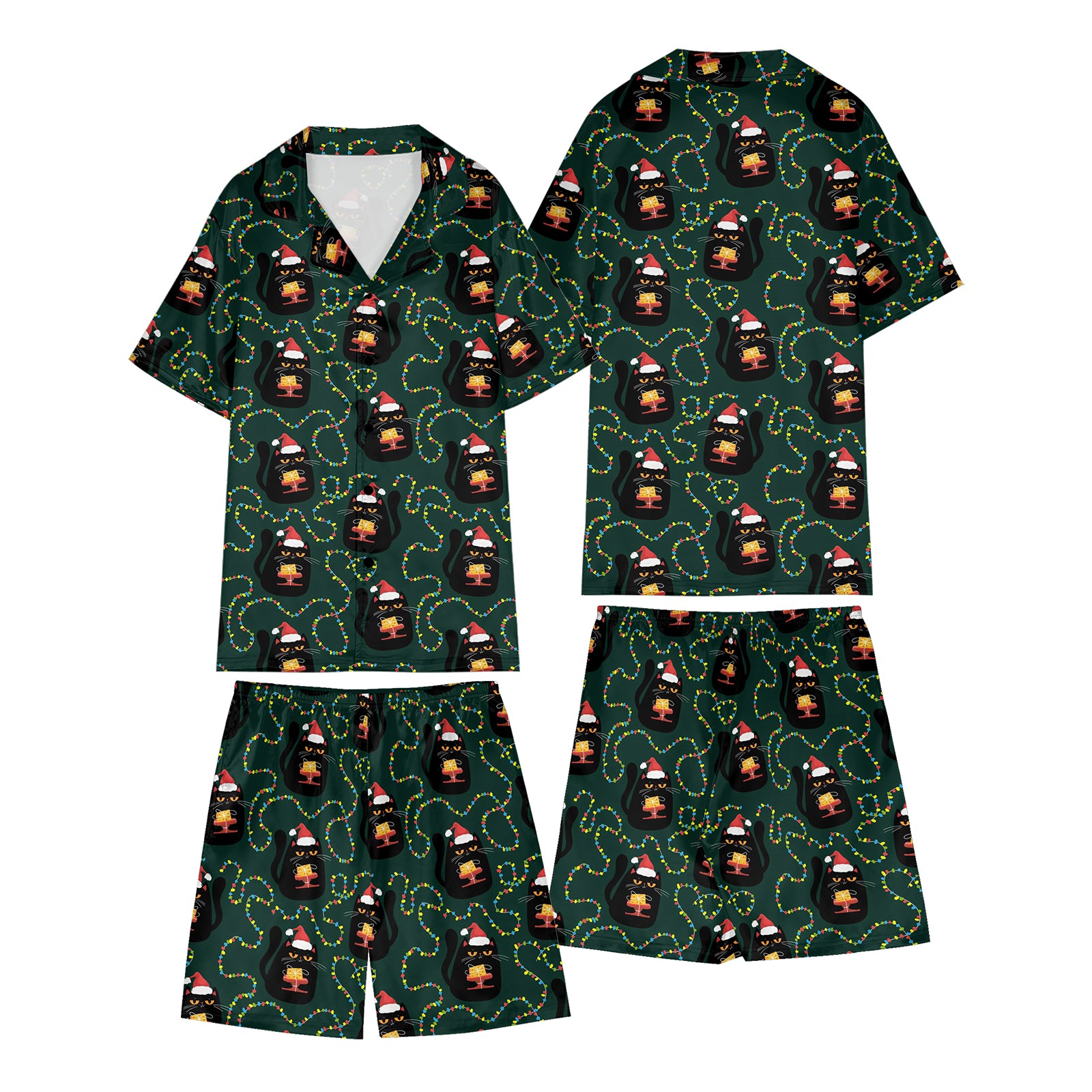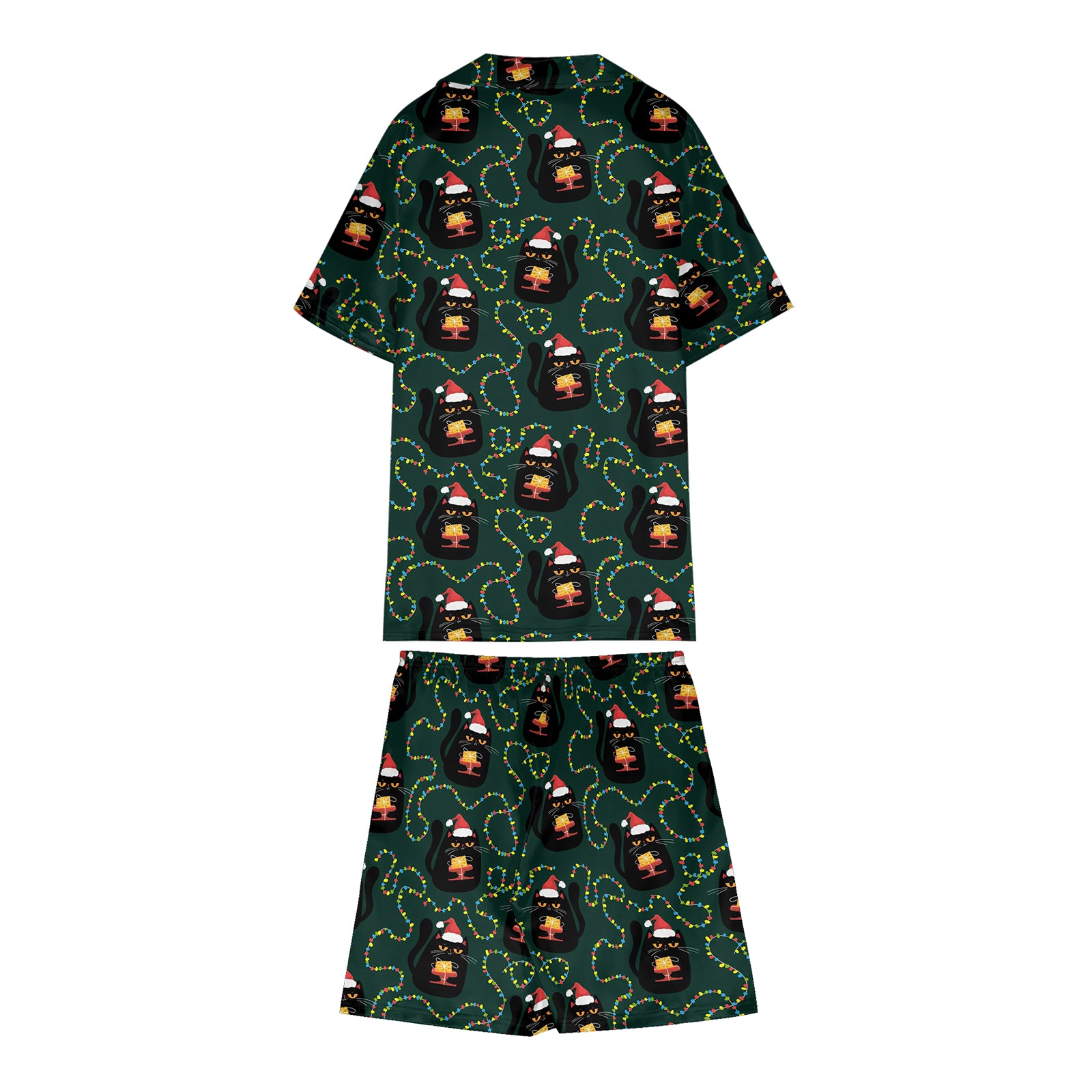 Black Cute Cat Christmas Satin Pajama Set For Women