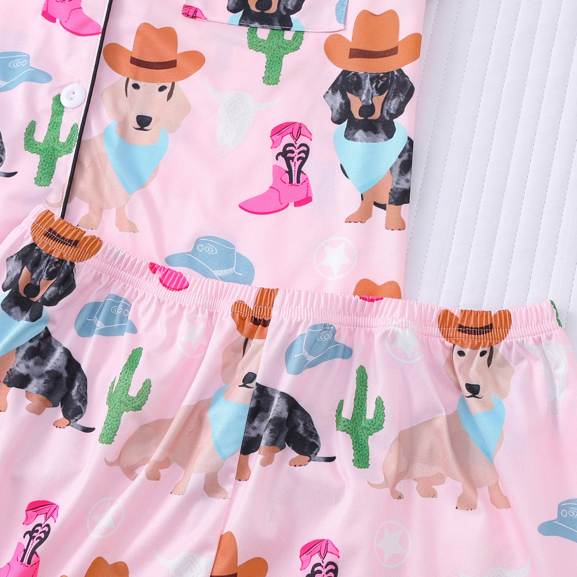 Pink Cute Puppies Bow Ribbed Knit Pajama Set For Women
