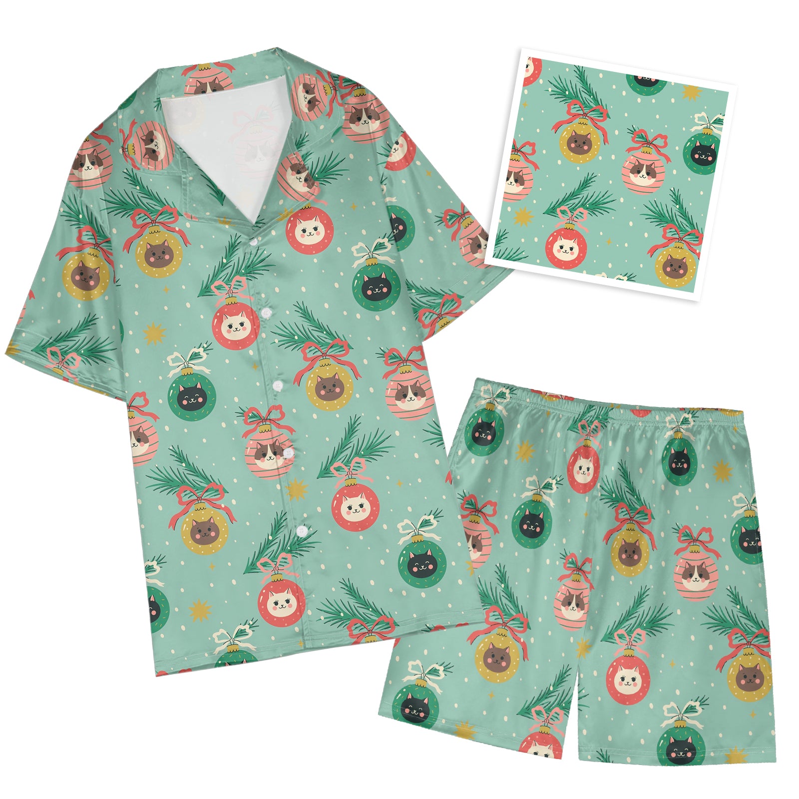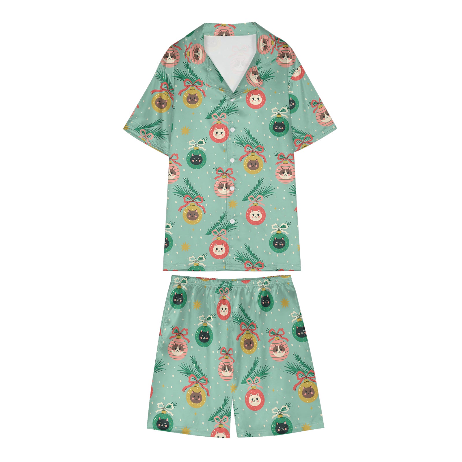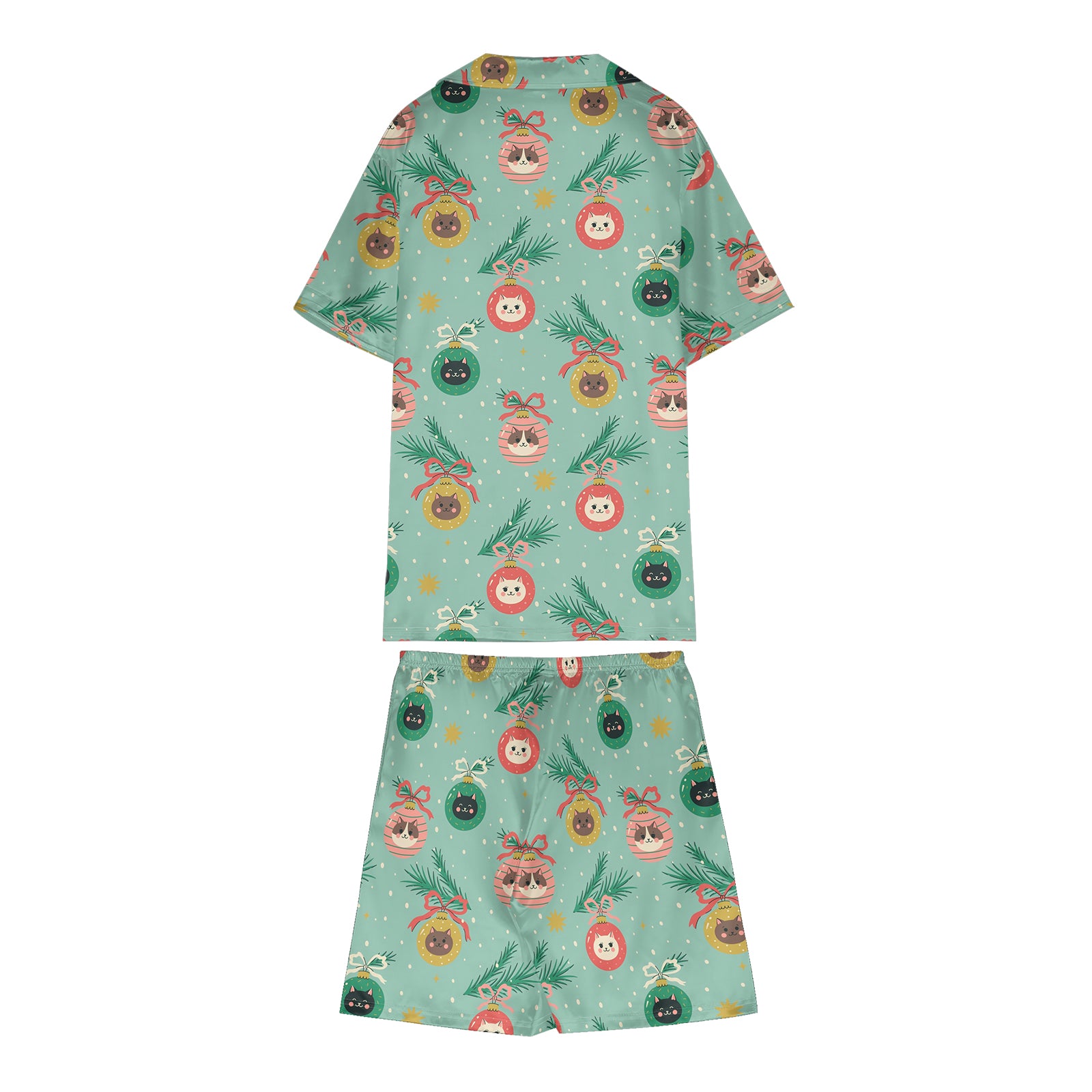 Christmas Balls with Cat Faces Satin Pajama Set For Women