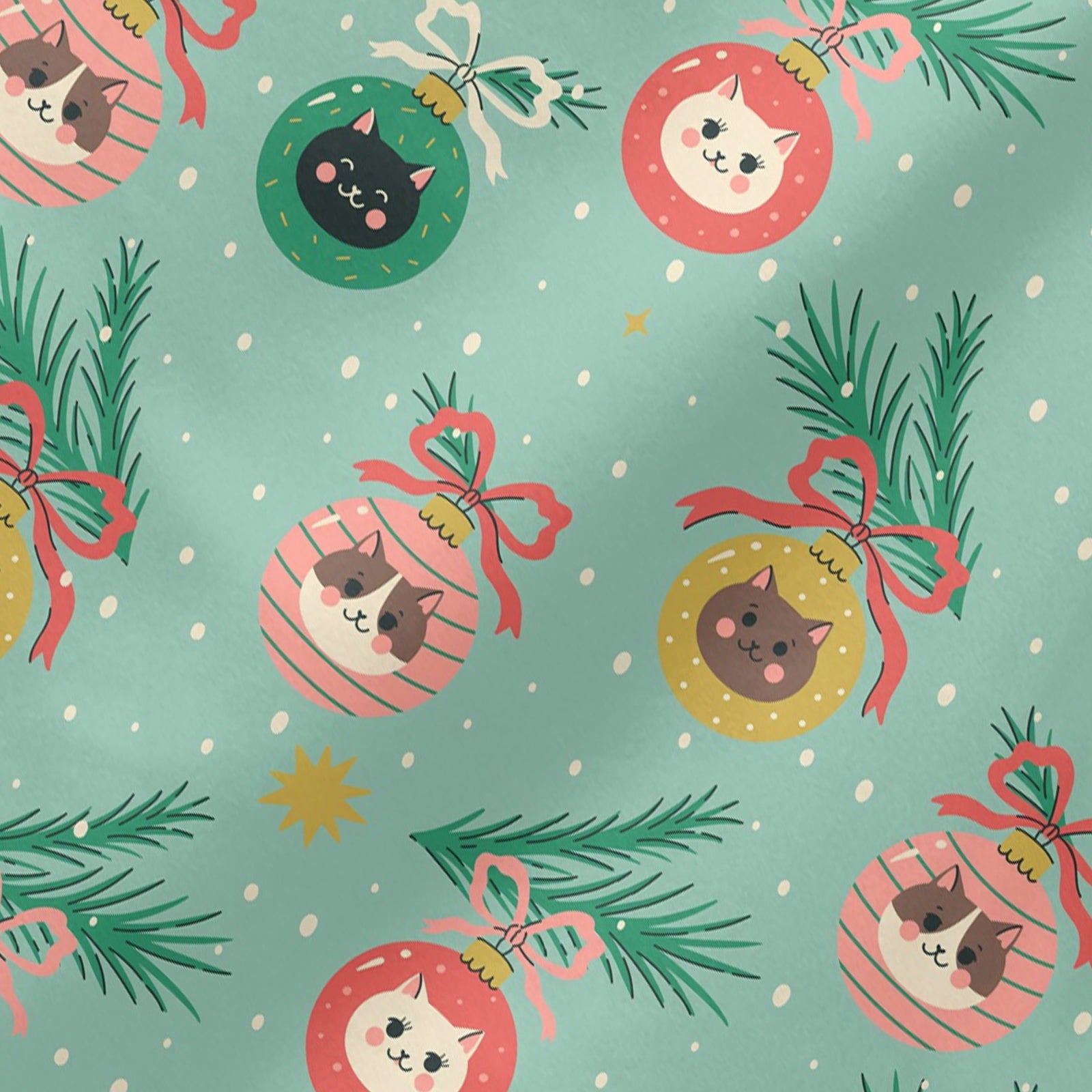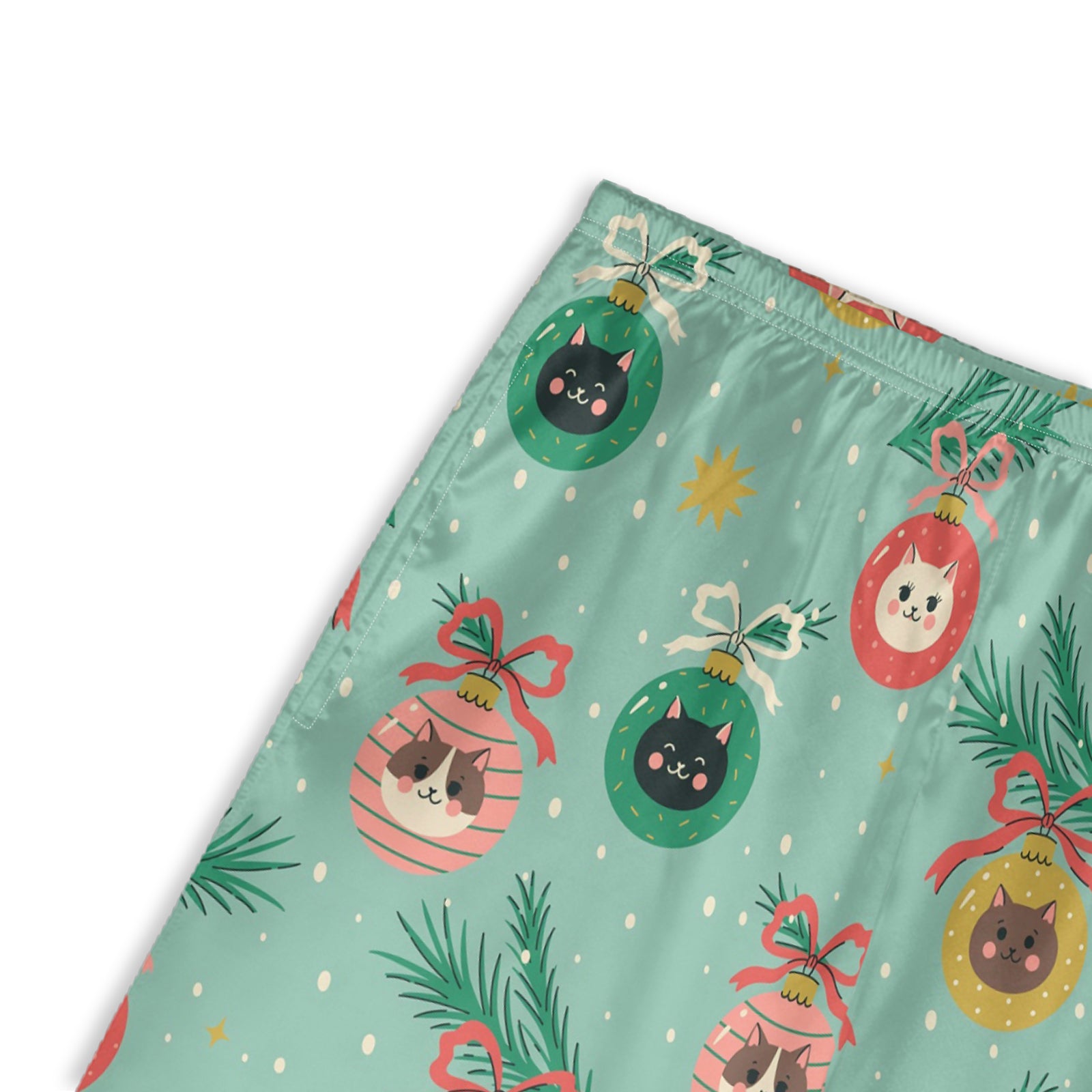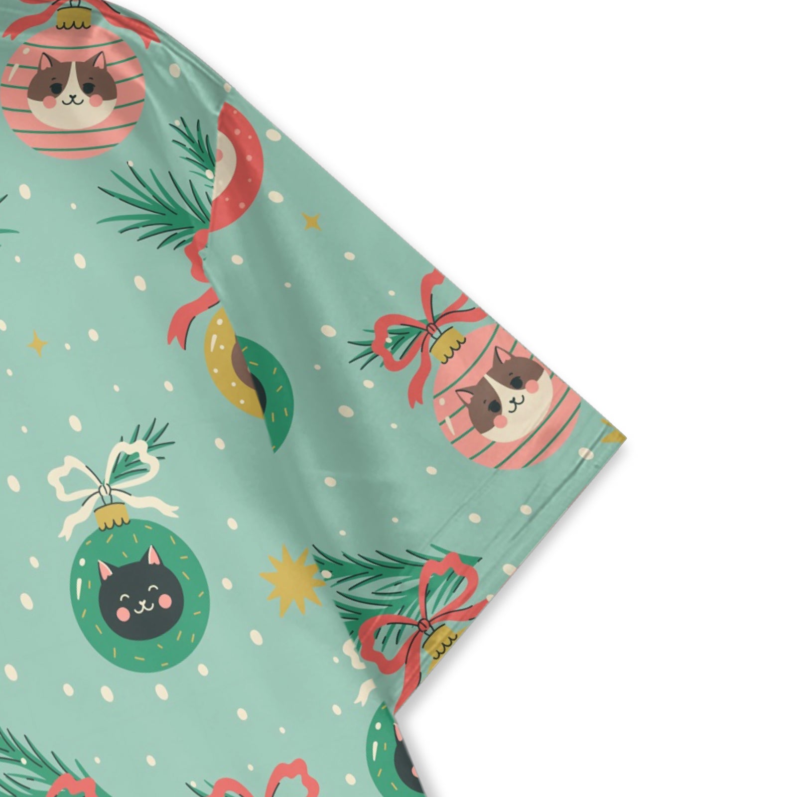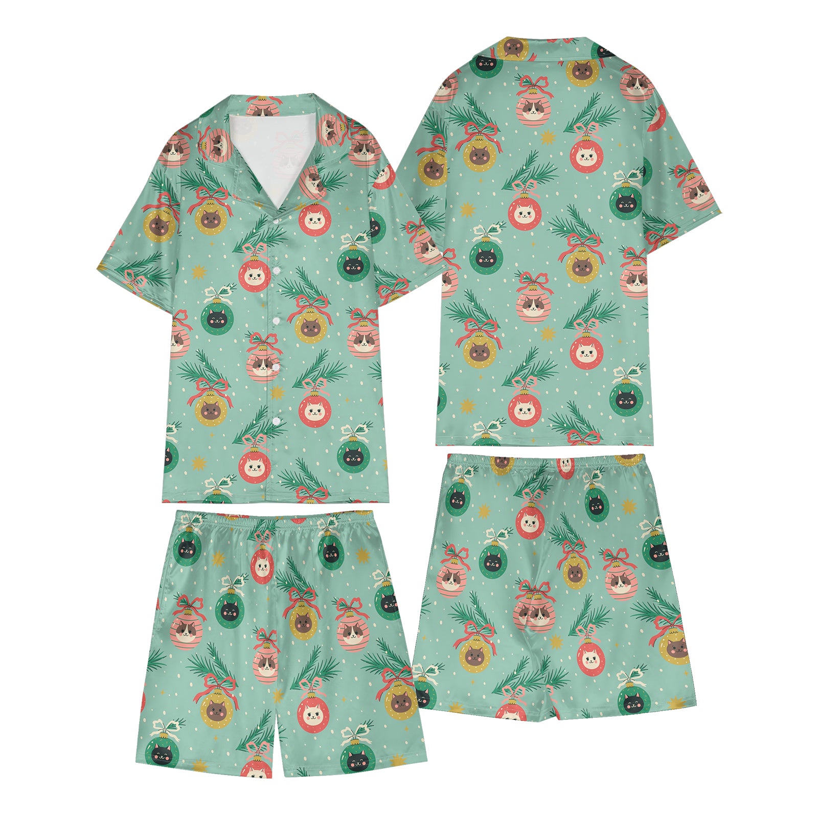 Christmas Balls with Cat Faces Satin Pajama Set For Women