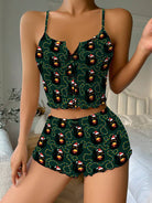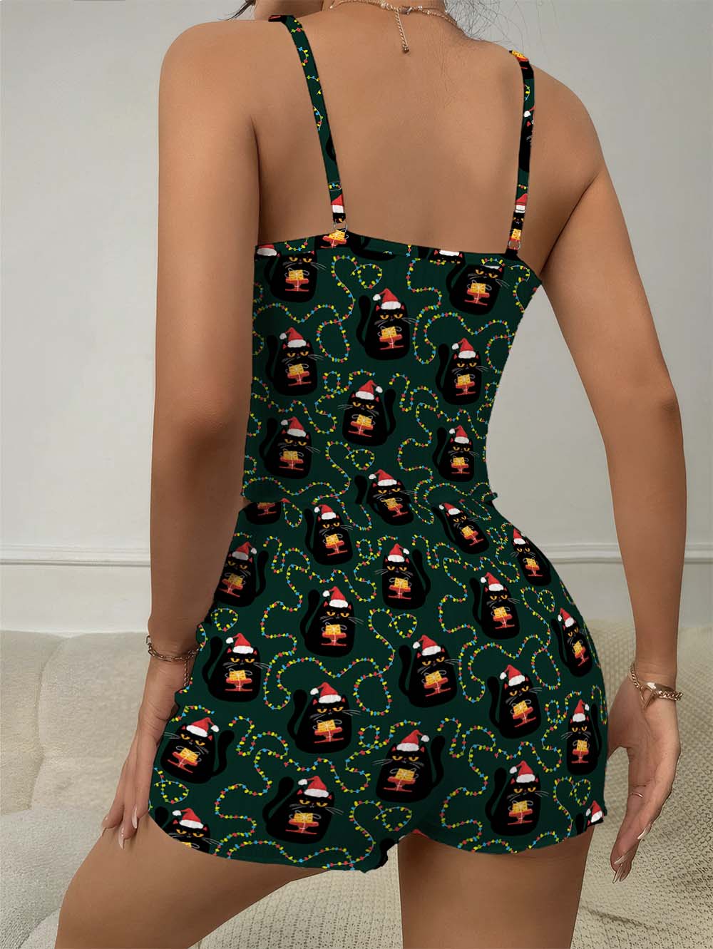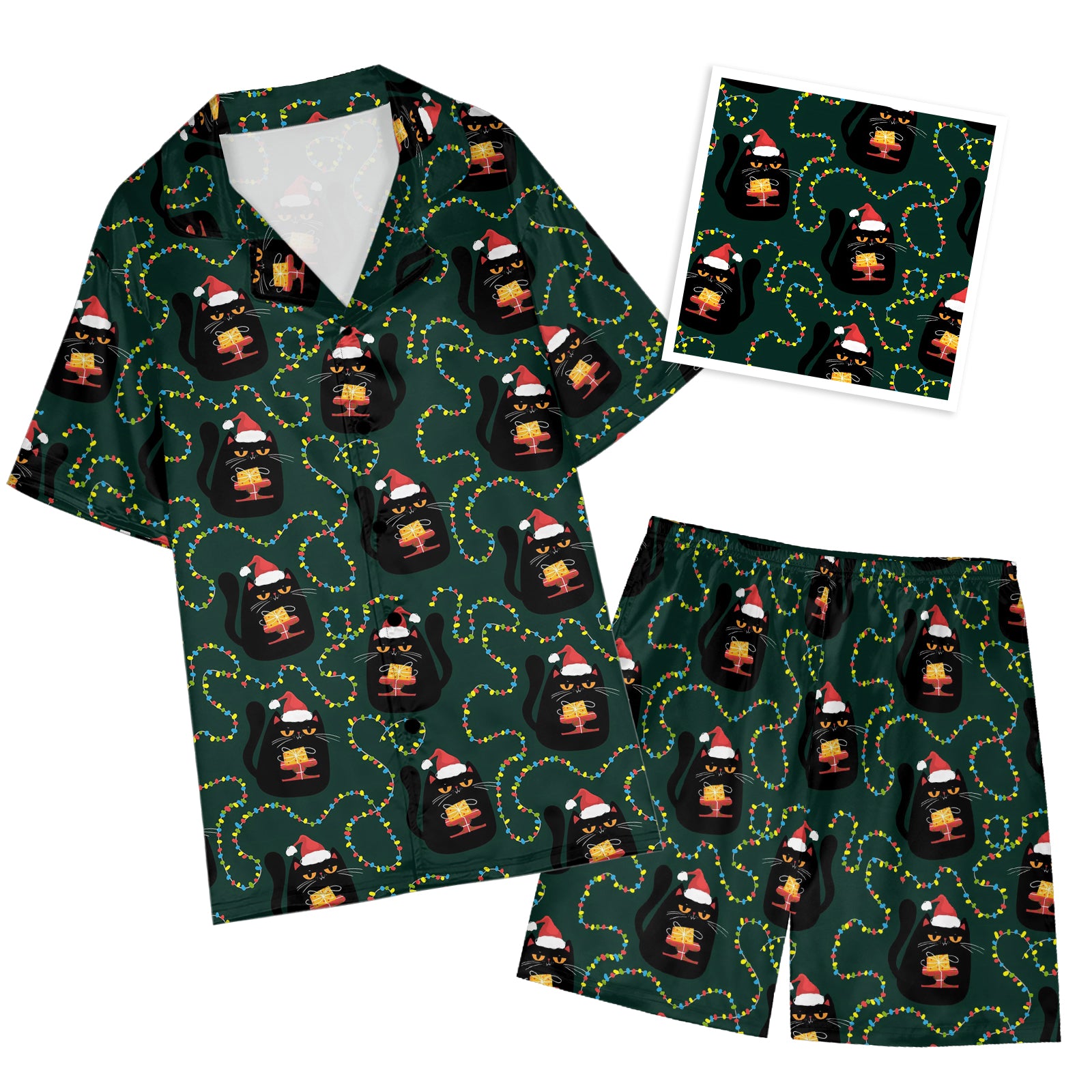 Green Cat and Gift Bow Ribbed Knit Pajama Set For Women