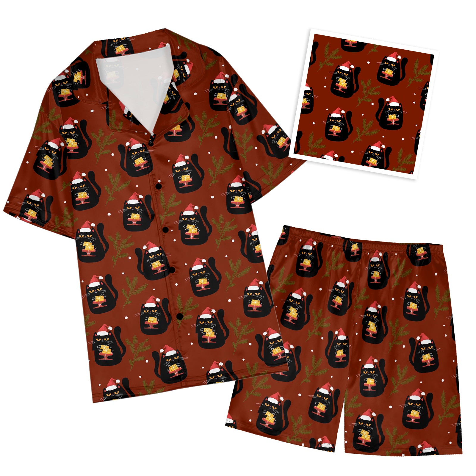Red Cat and Gift Bow Ribbed Knit Pajama Set For Women