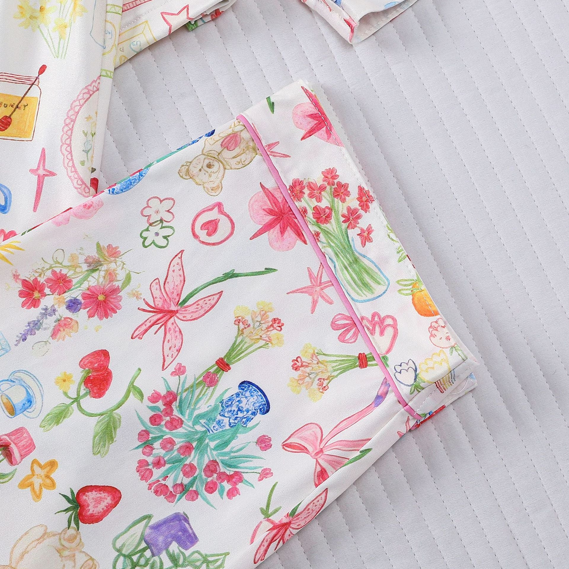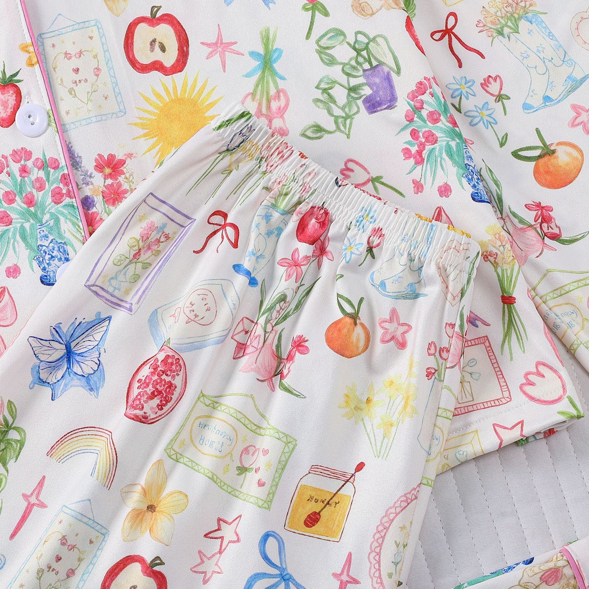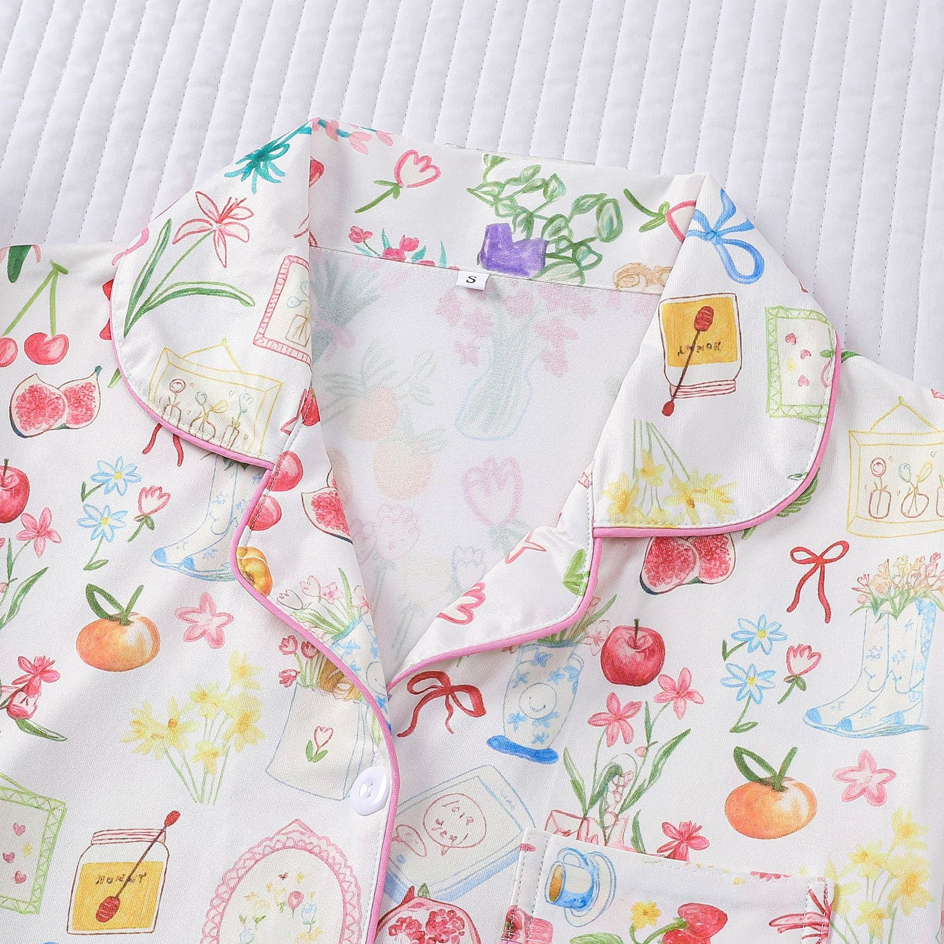 Abstract Floral Cute Draw Satin Pajama Set For Women