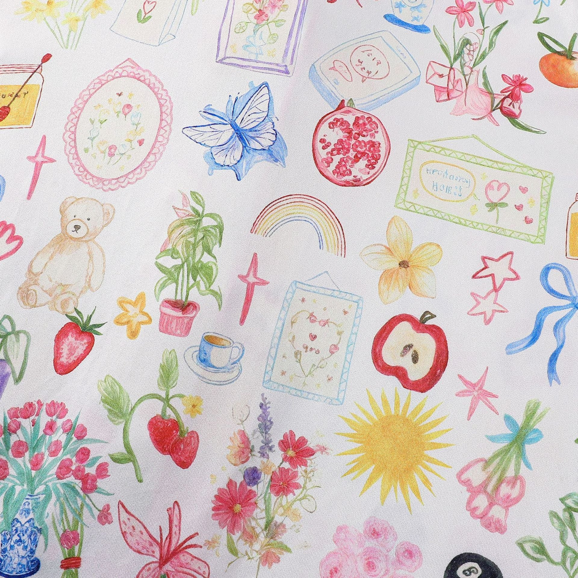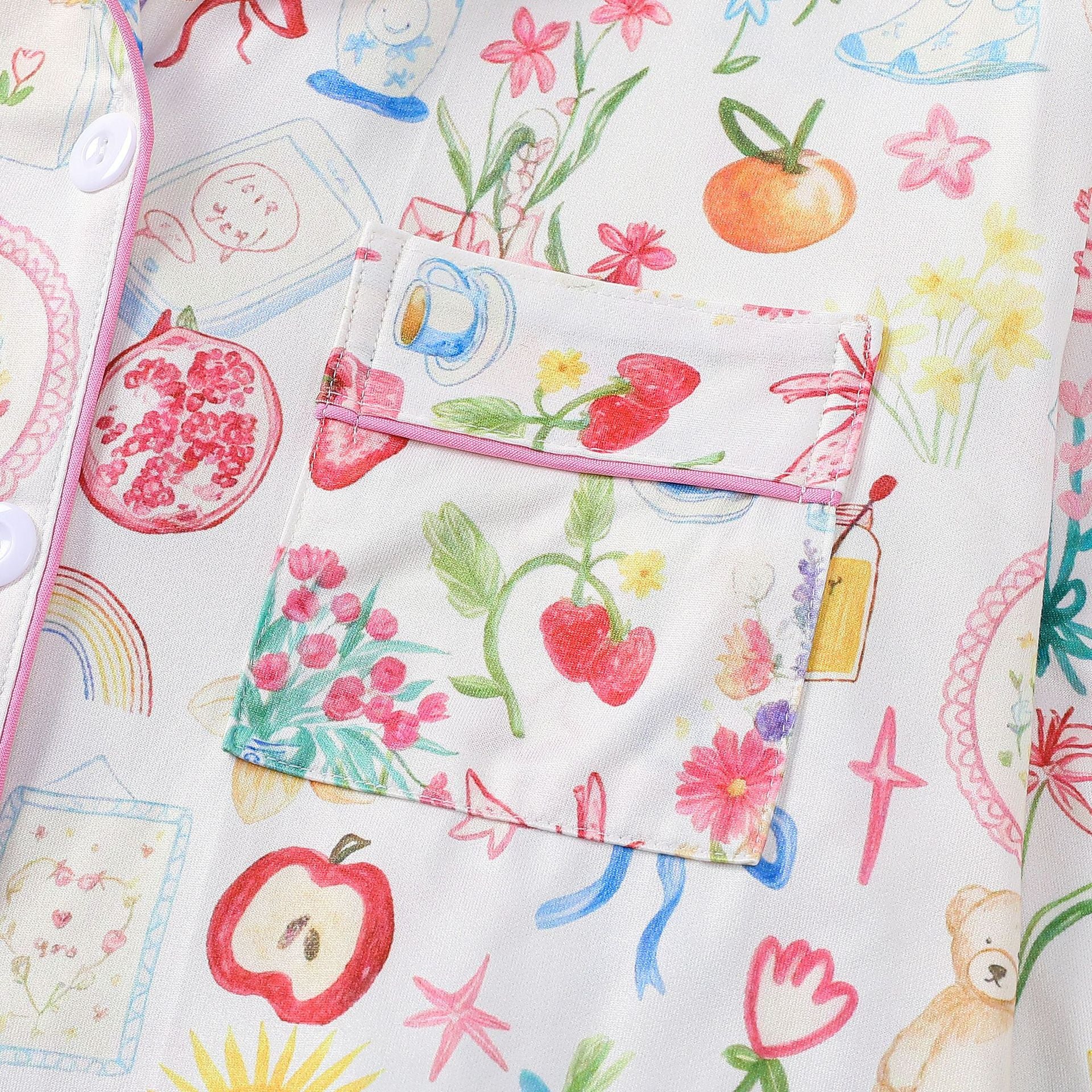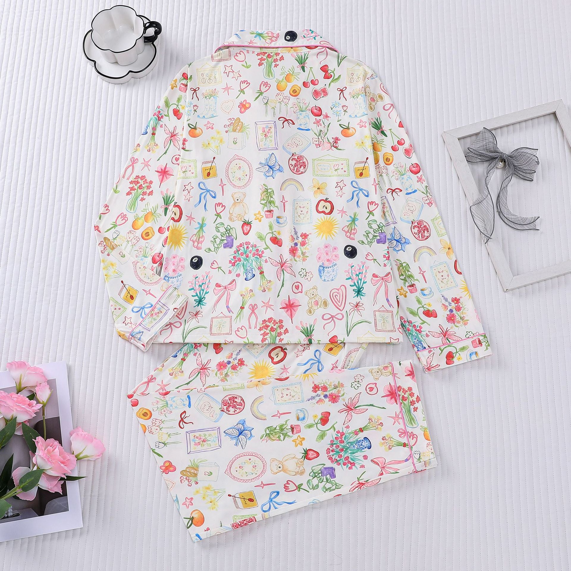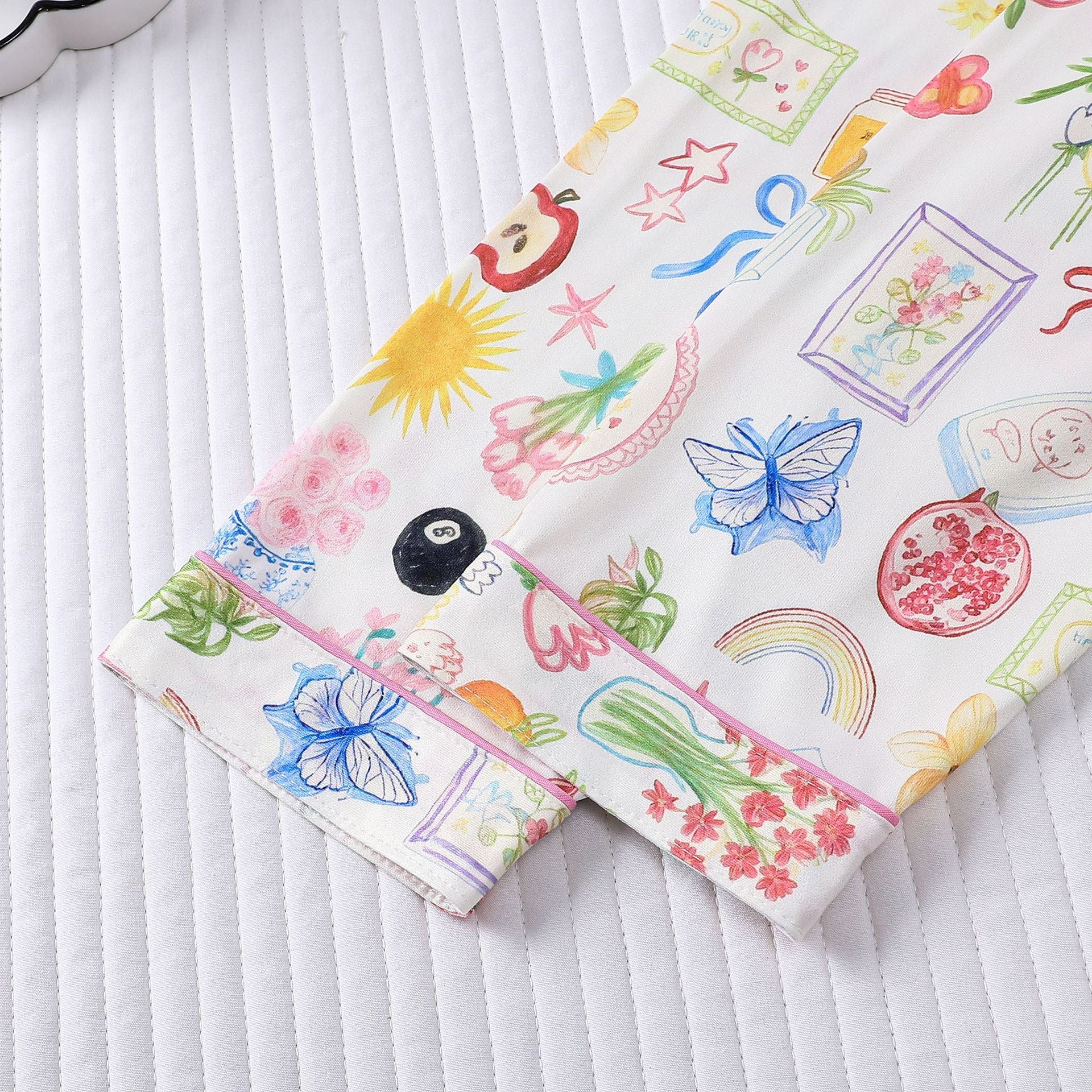 Abstract Floral Cute Draw Satin Pajama Set For Women