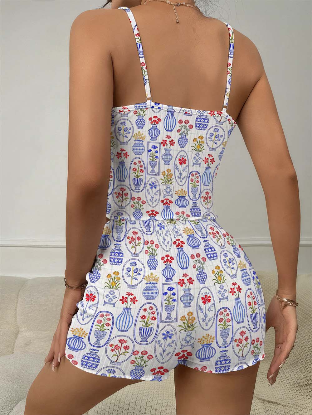 Blue Flower Pots Bow Ribbed Knit Pajama Set For Women