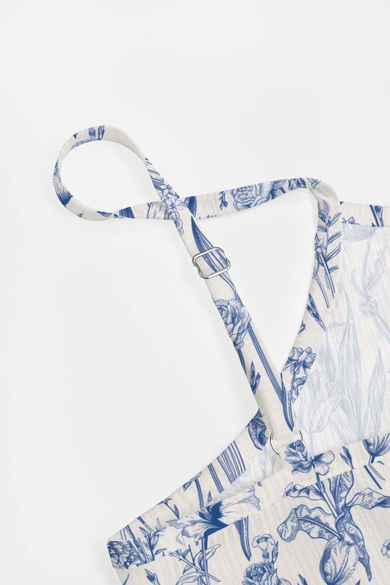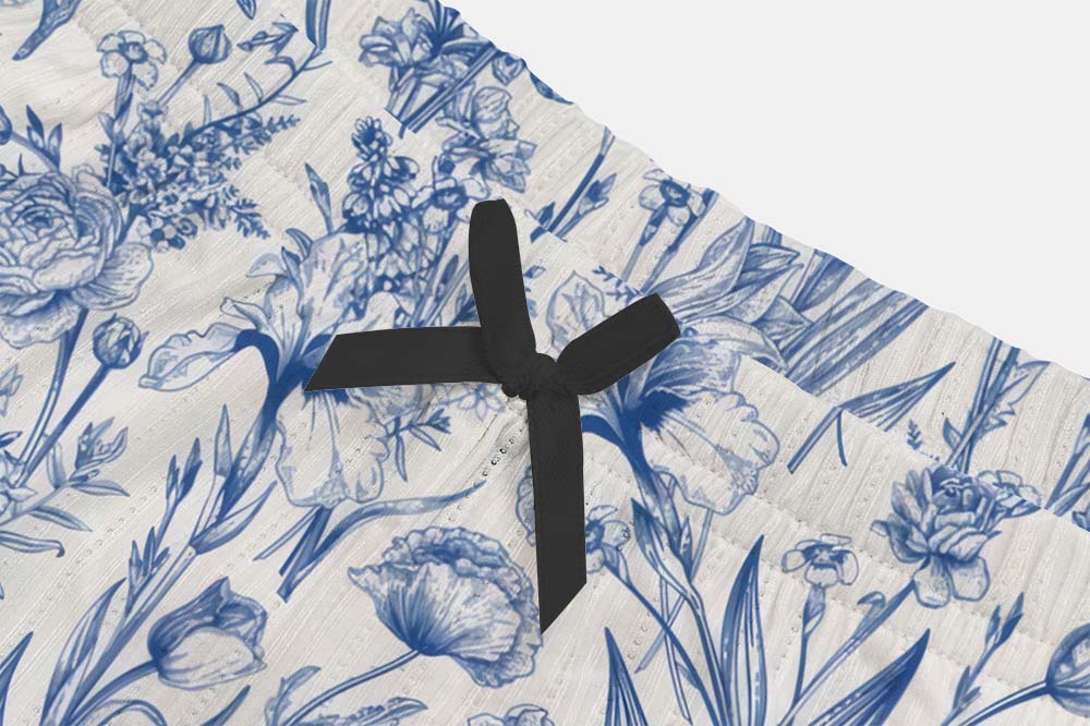 Blue Line Flowers Bow Ribbed Knit Pajama Set For Women