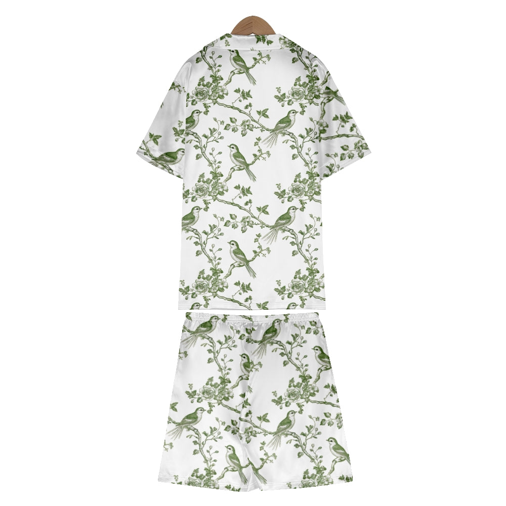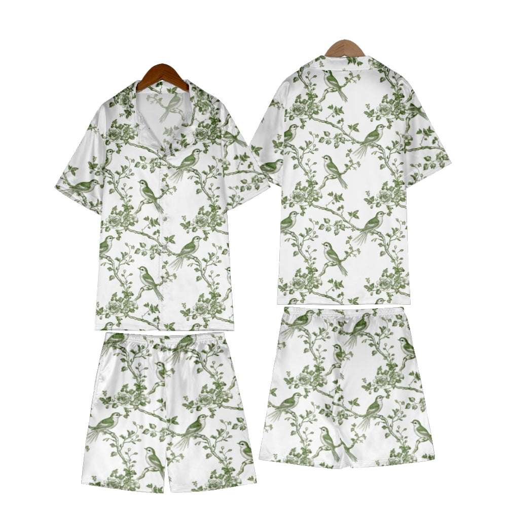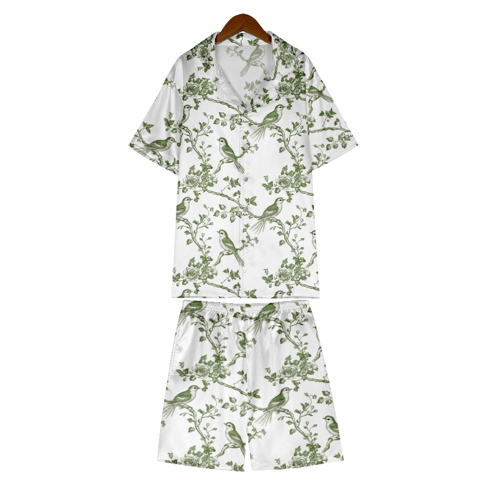 Green Chinoiserie Birdie Toile De Jouy Satin Pajama Set For Women