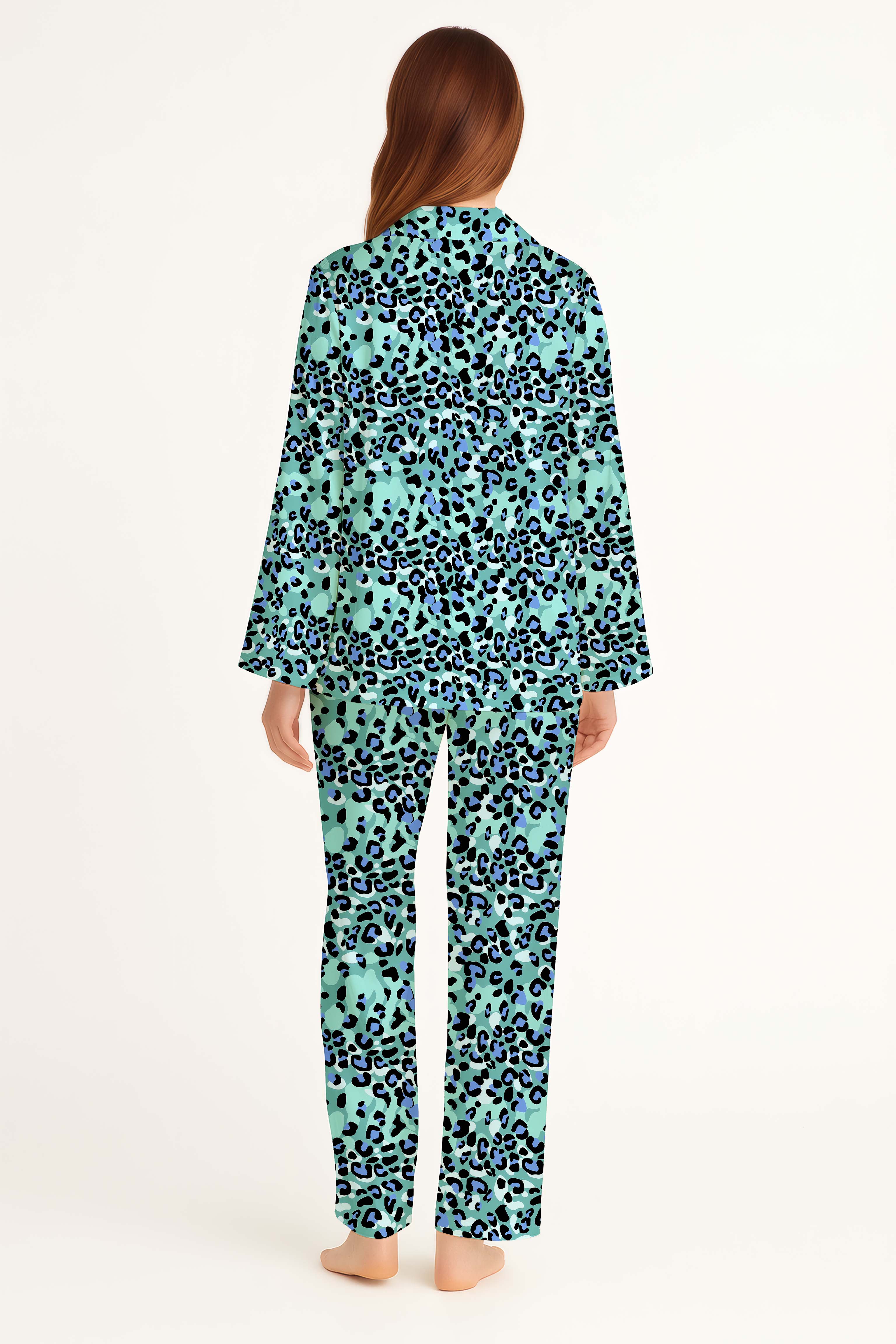 Abstract Modern Leopard Satin Pajama Long Set For Women