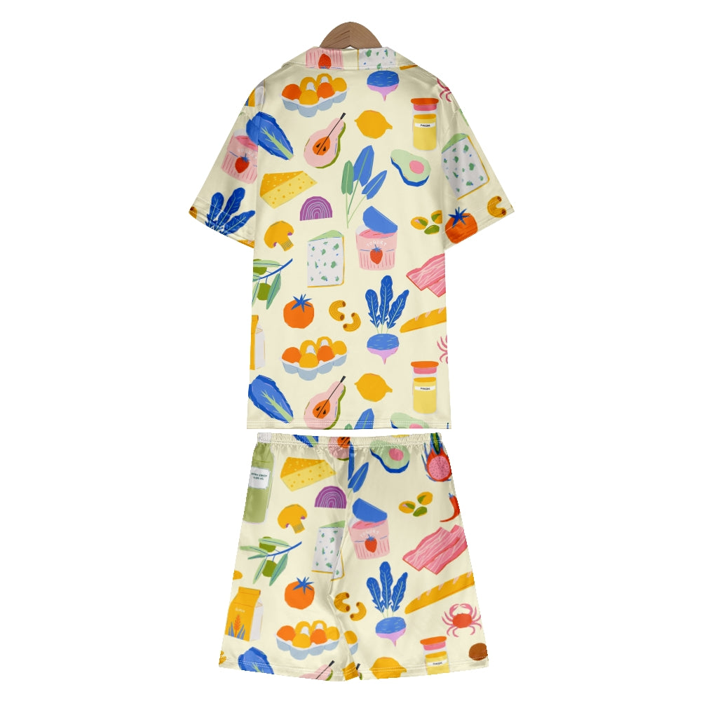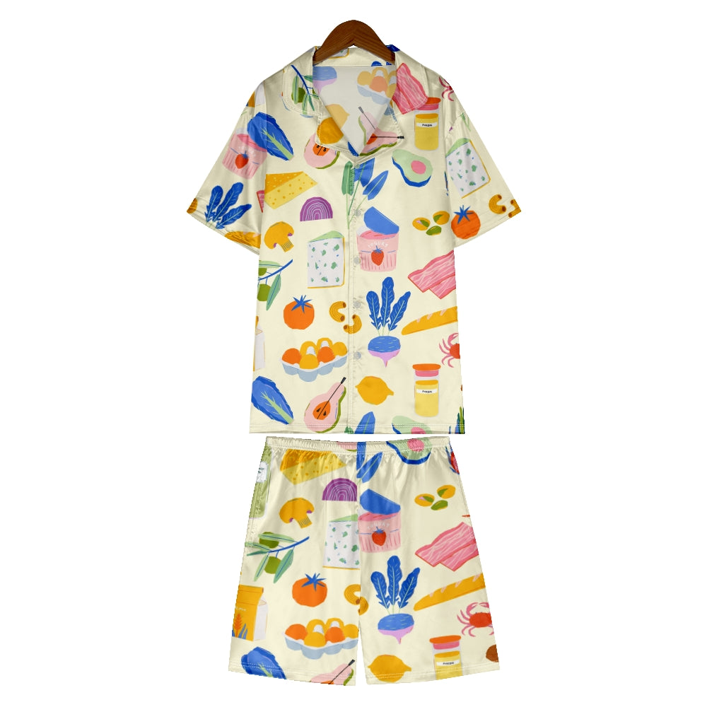 Yellow Cute draw Breakfast Satin Pajama Set For Women