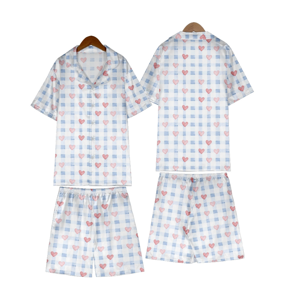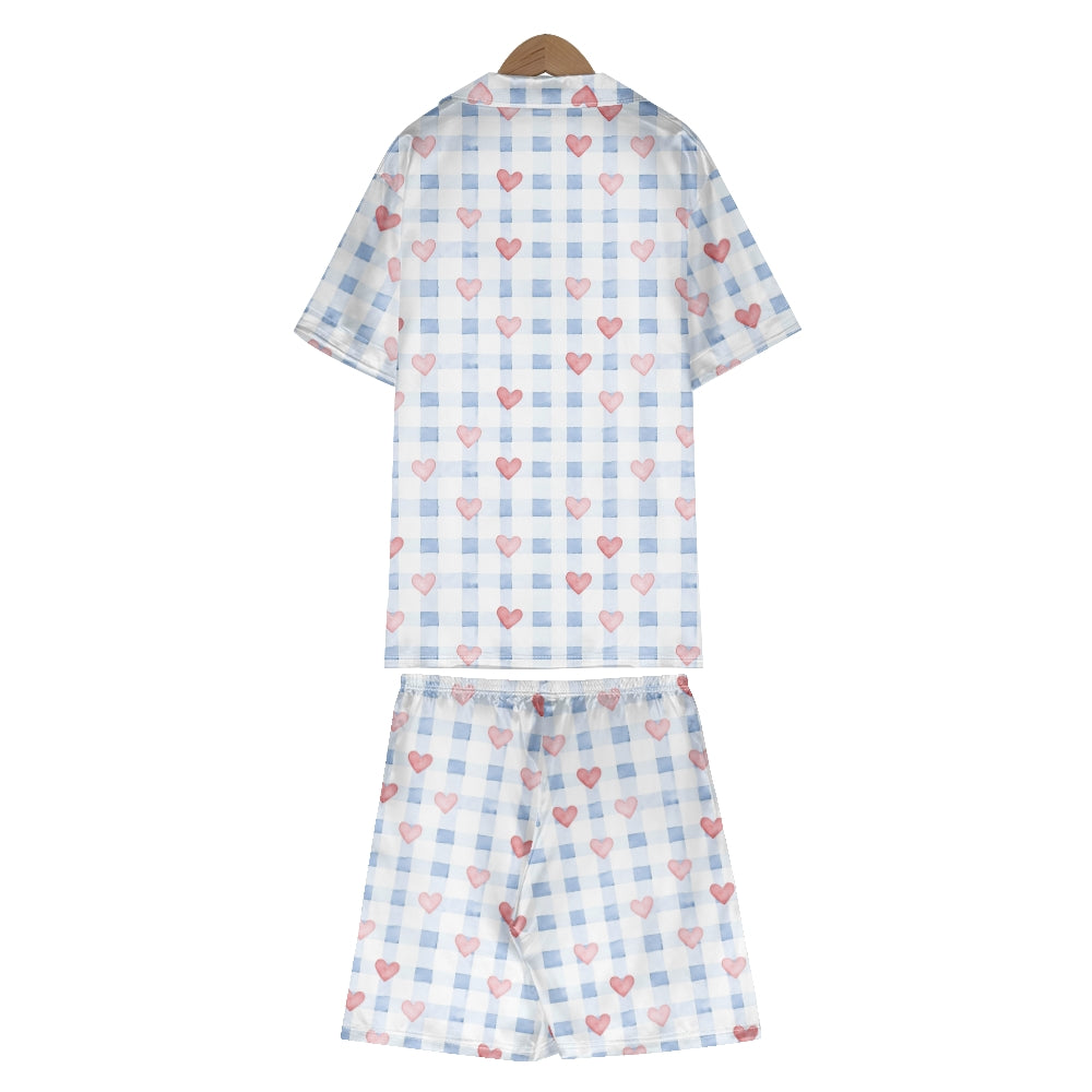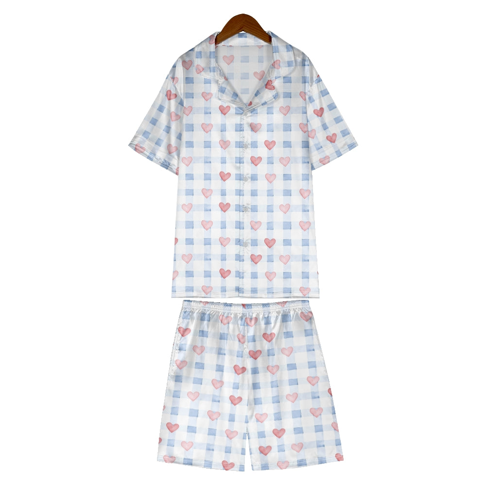 Blue Plaid Heart Satin Pajama Set For Women