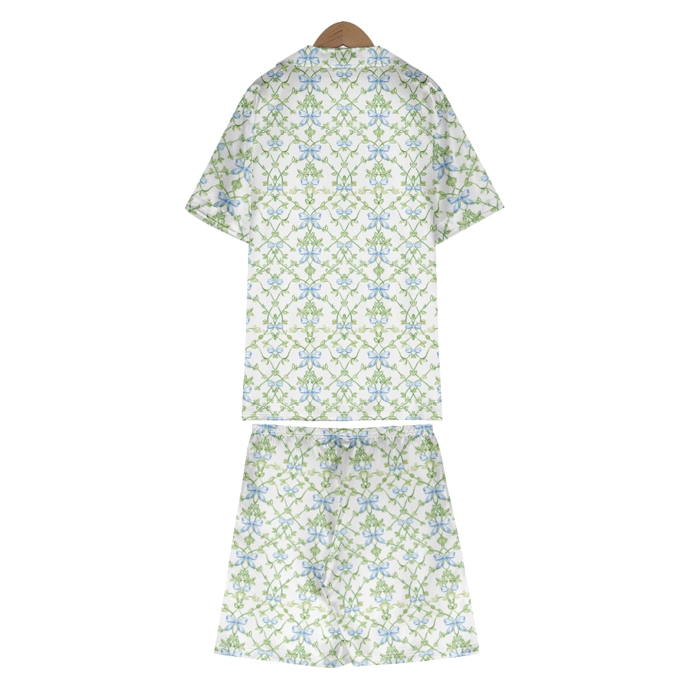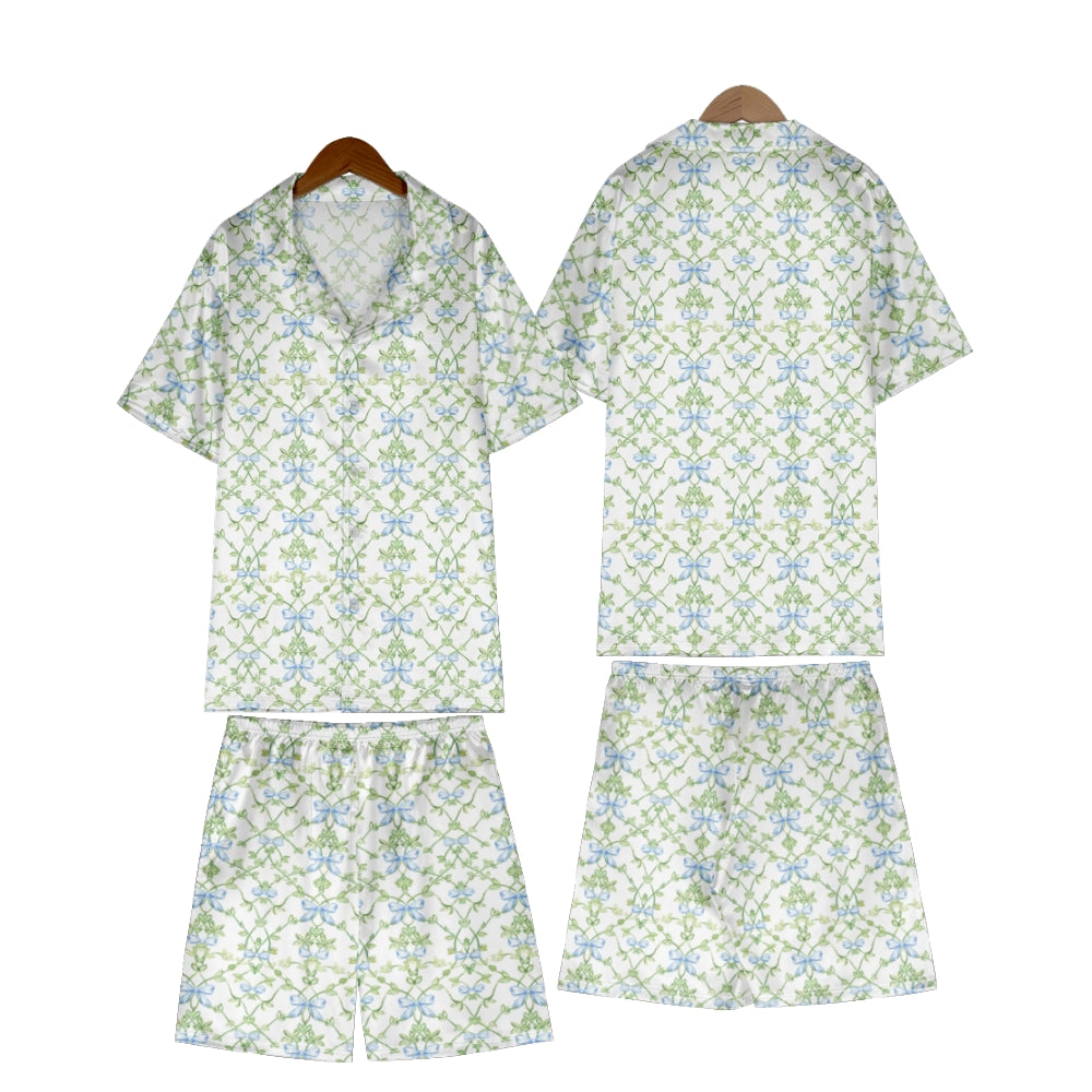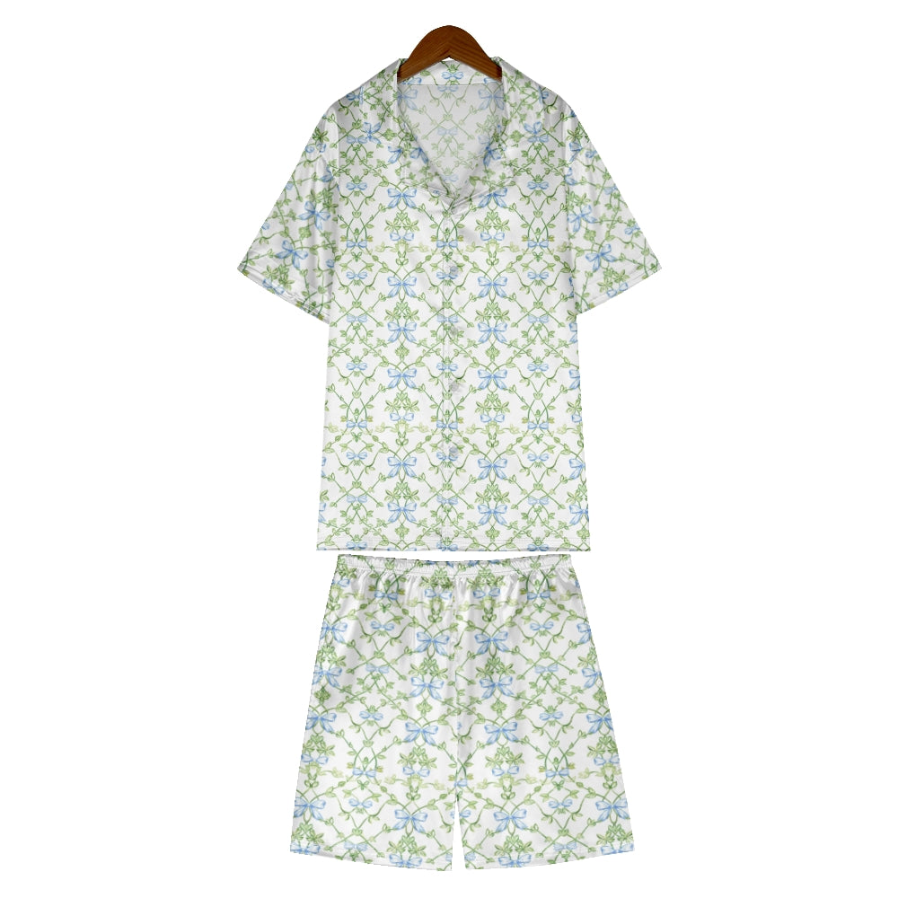 Blue Bow Vine Satin Pajama Set For Women