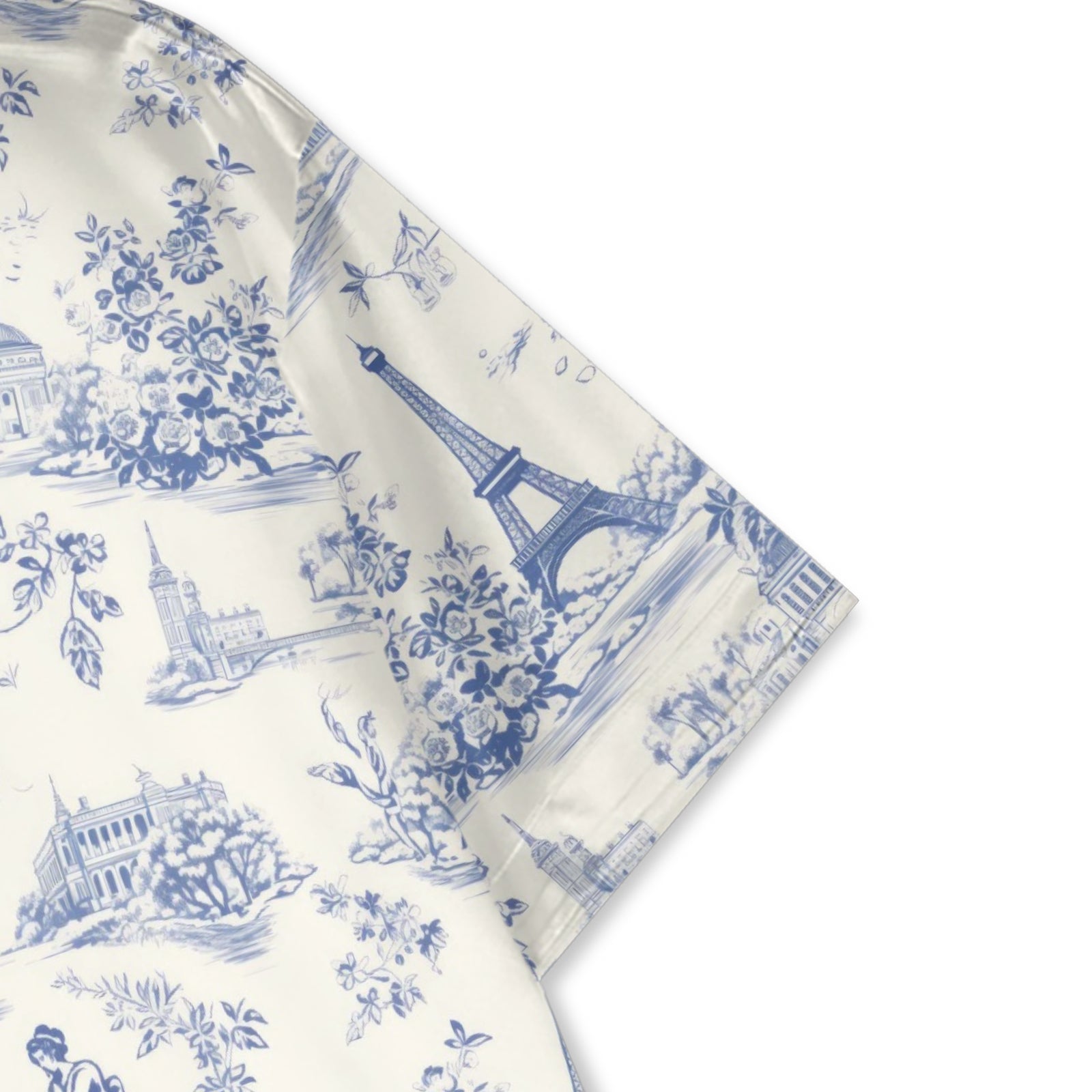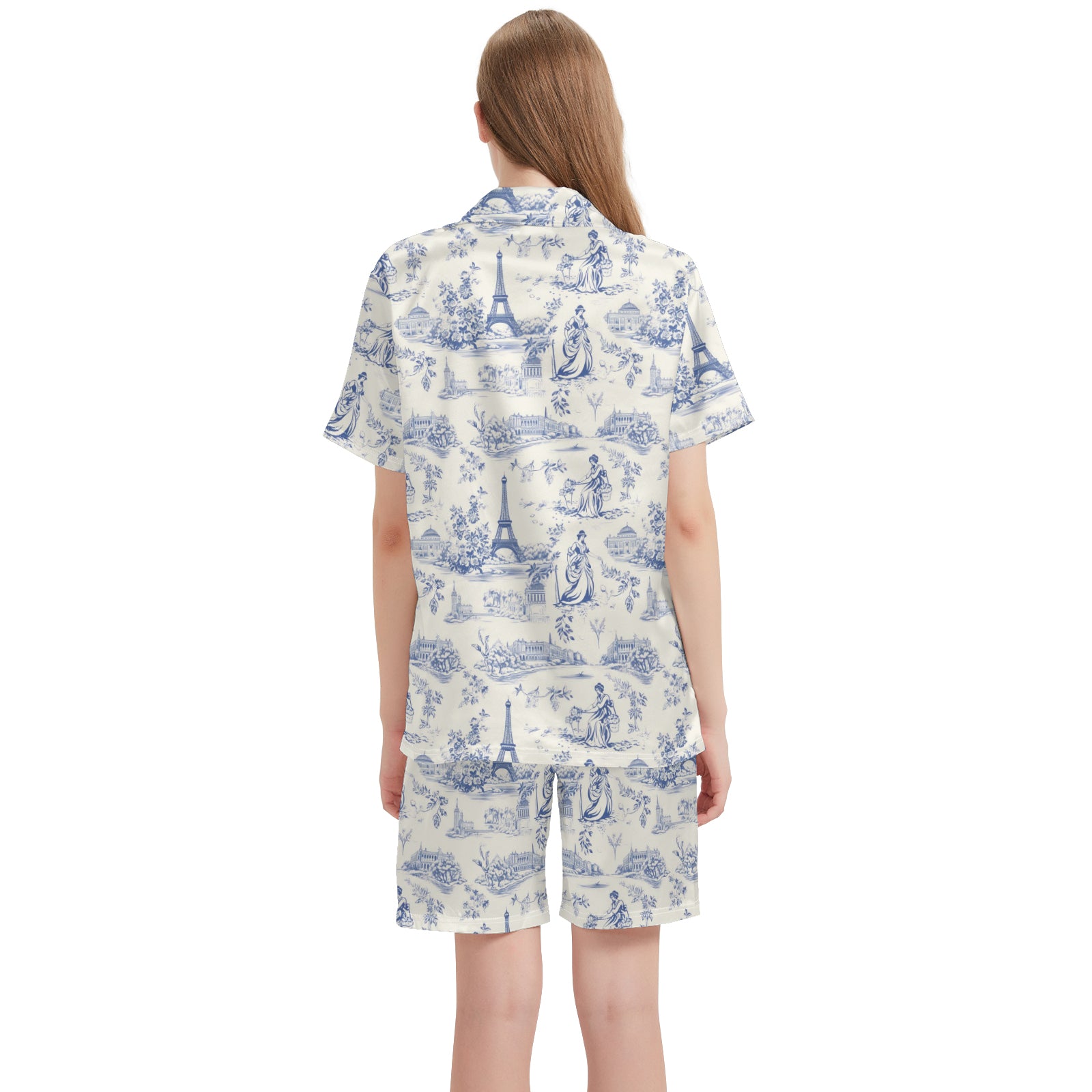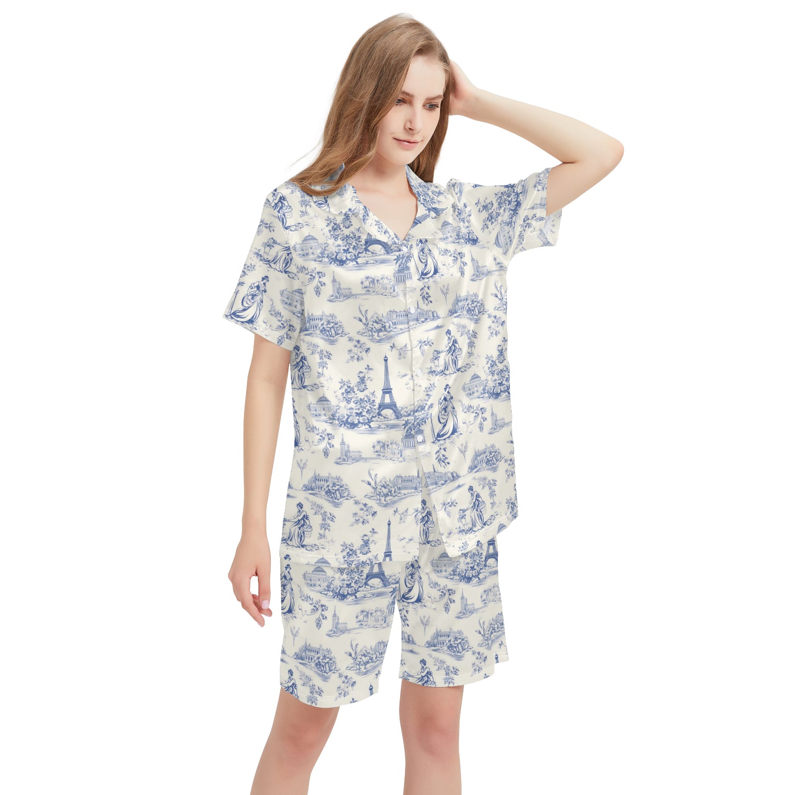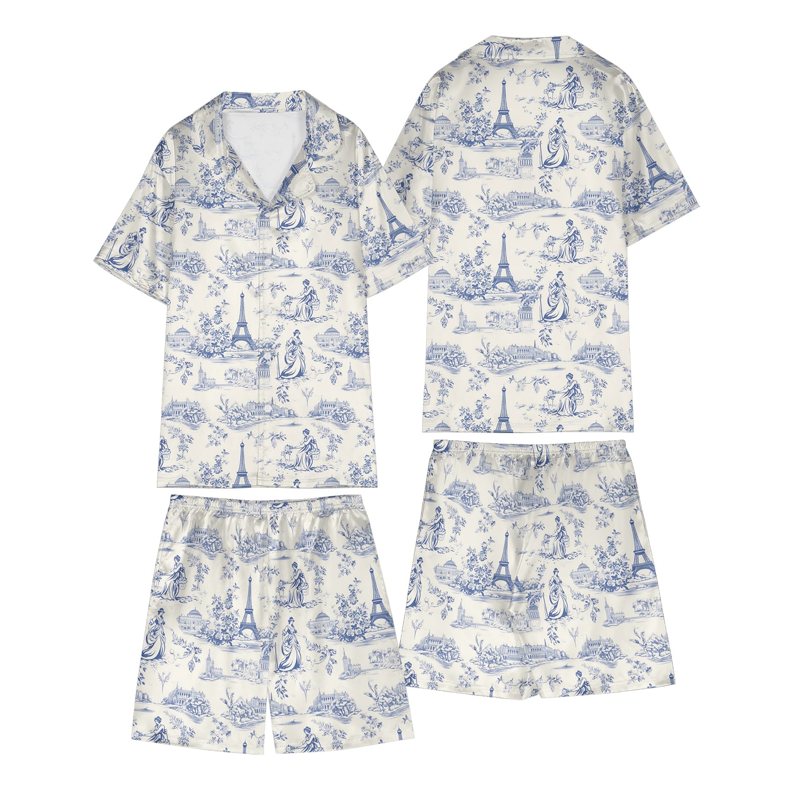 Blue Eiffel Tower Toile De Jouy Satin Pajama Set For Women