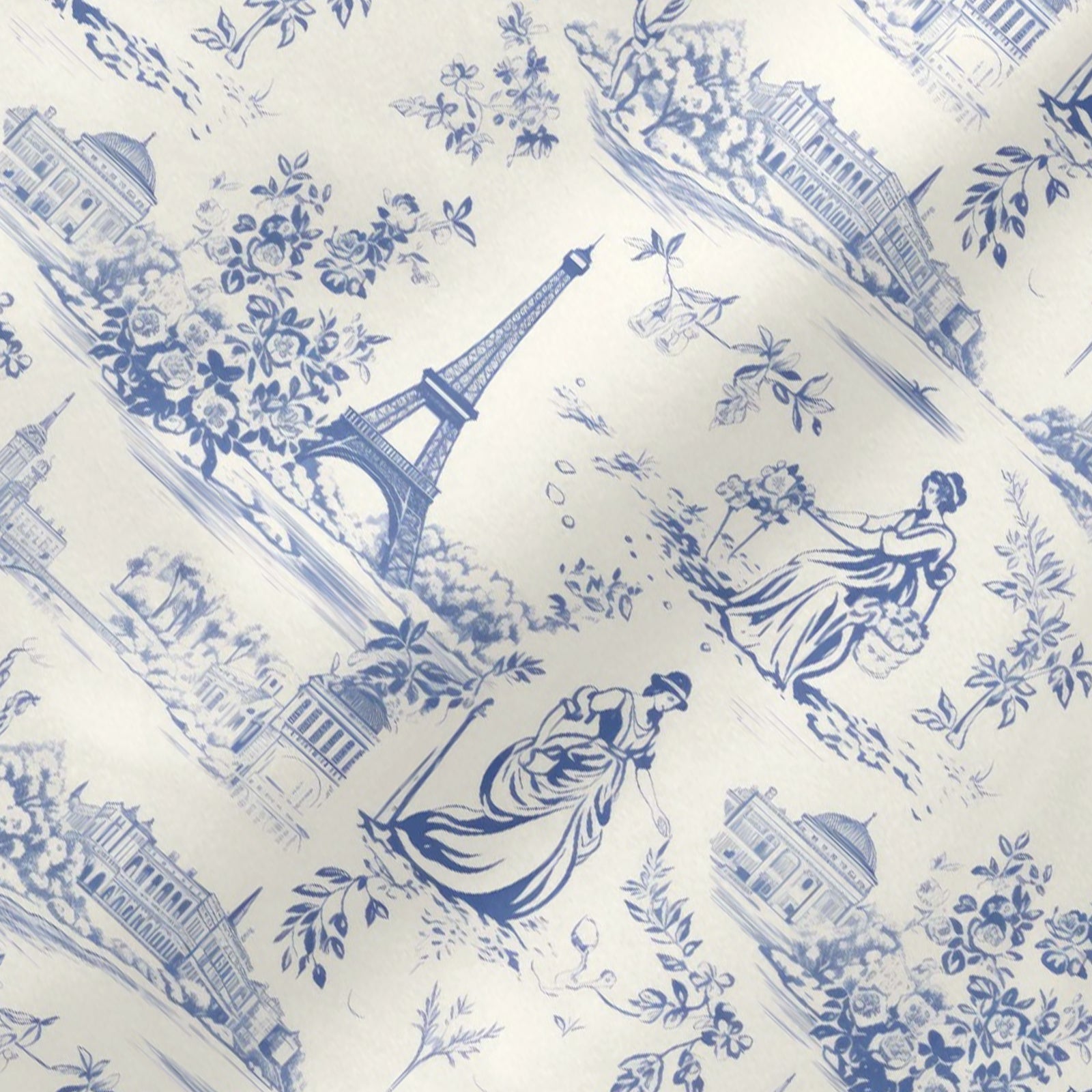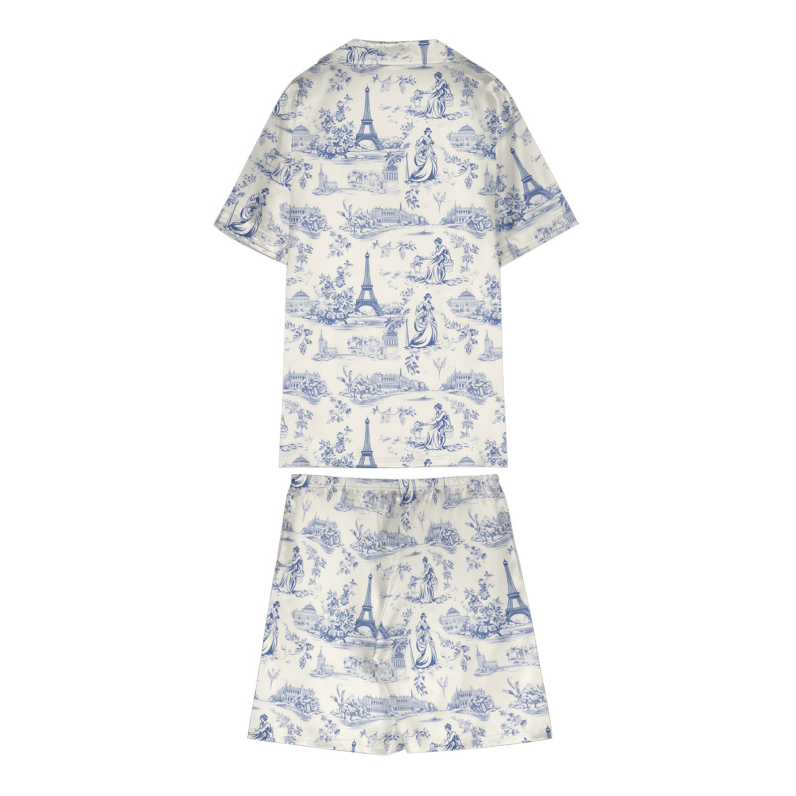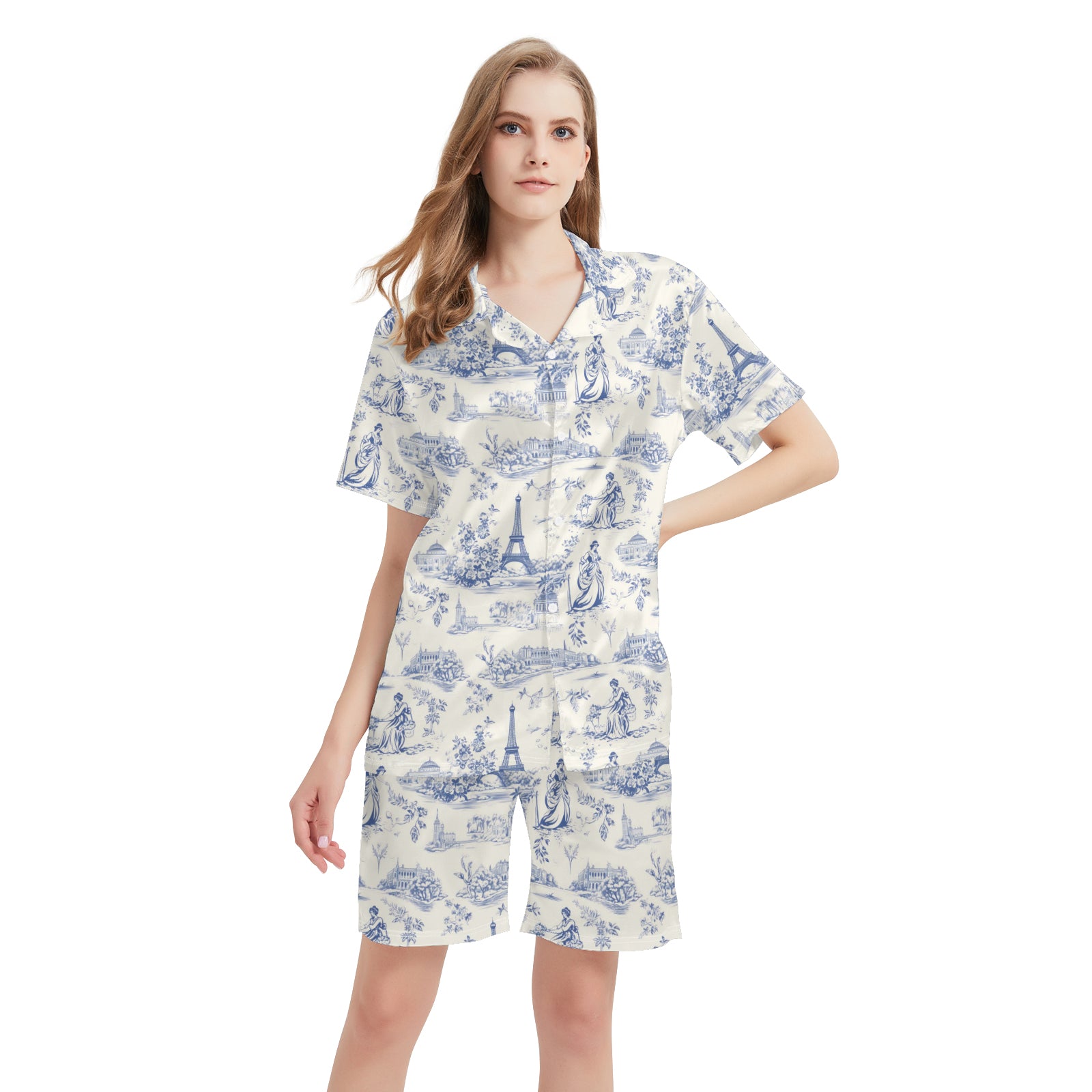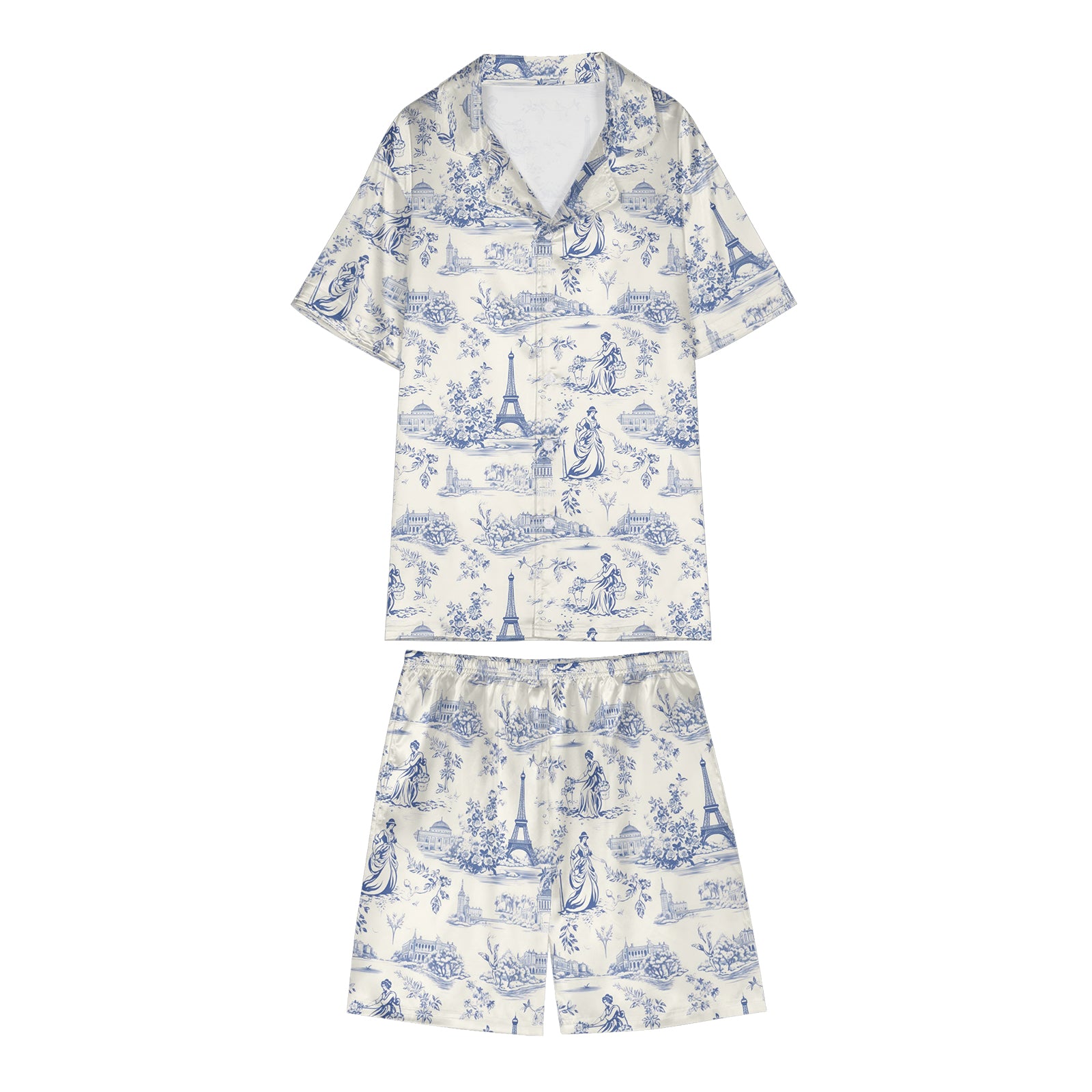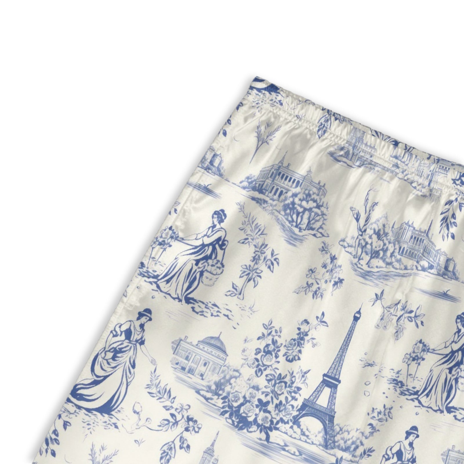 Blue Eiffel Tower Toile De Jouy Satin Pajama Set For Women